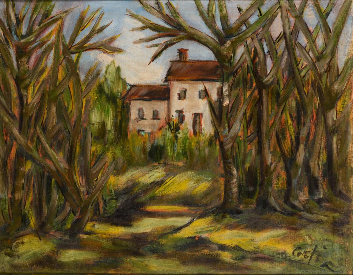 Modern gemalte Landschaft mit Villa zwischen kahlen Bäumen.