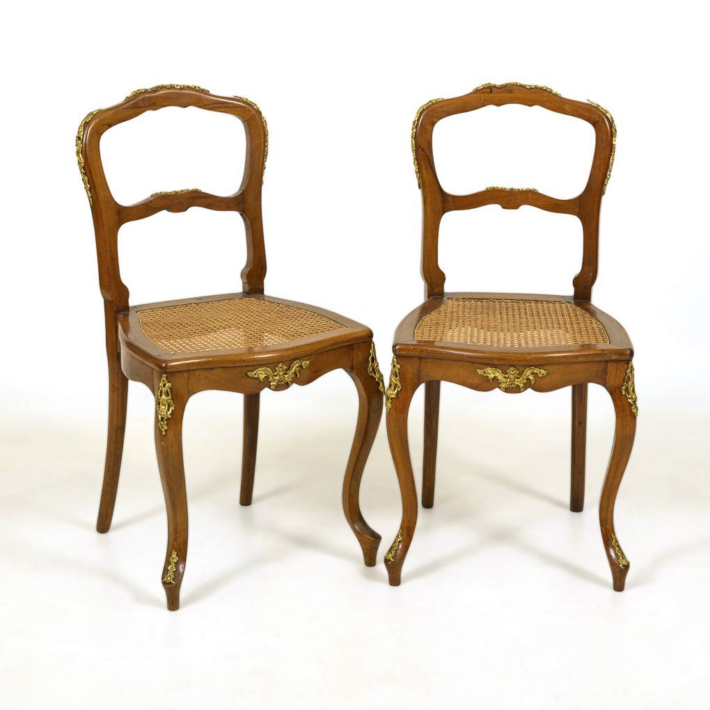 Geschweifte Rückenlehne mit geschwungenem Mittelsteg, geschweifte Sitzfläche mit Wiener Geflecht, auf frontseitig geschwungenen und rückseitig gebogten Beinen. Florale Bronzebeschläge. Restauriert, mit Ergänzungen.
