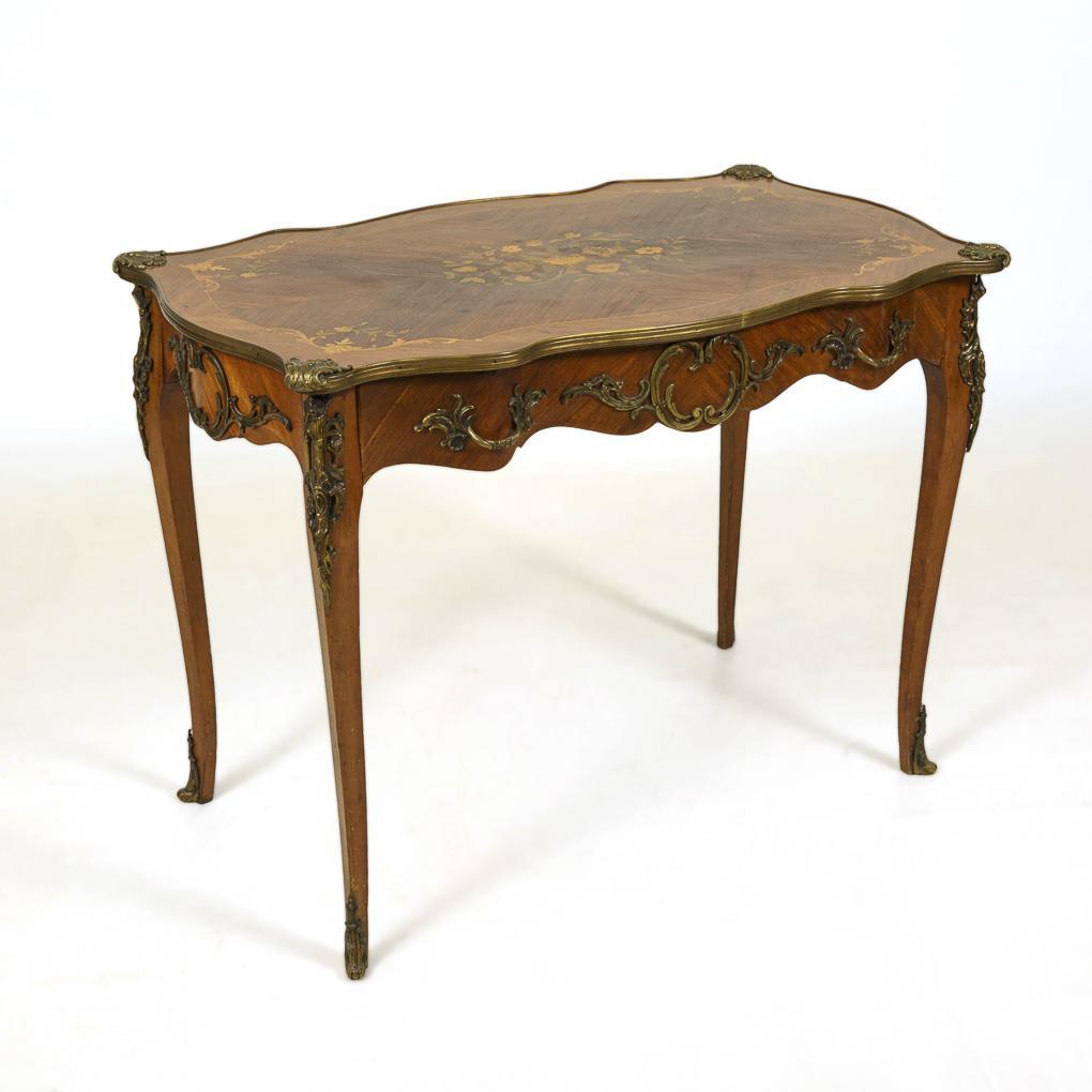 Geschweifte Deckplatte mit profilierter Messingkante und farbigen Blumenintarsien, geschweifte Zarge, Schub mit Bronzegriffen, auf 4 geschwungenen Spitzbeinen. Florale Bronzebeschläge. Alters- und Gebrauchsspuren, etwas restaurierungsbedürftig.