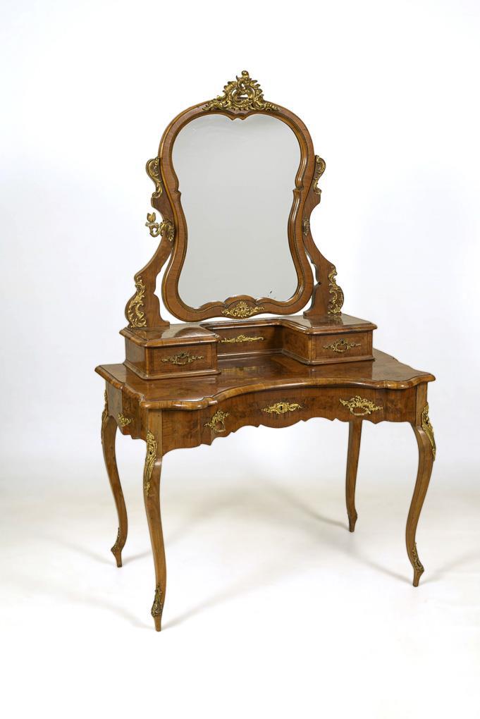Auf 4 Cabriolbeinen stehender Tisch mit geschwungener Platte und Schub in der geschweiften Zarge. Abnehmbarer Aufsatz mit 2 Schüben sowie drehbar gelagertem, geschweiften Spiegel an den geschwungenen Haltewangen. Reich mit Bronze-Beschlägen verziert, seitlich 1 Kerzenleuchter, 1 Leuchter fehlend. Leichte Alters- und Gebrauchsspuren, Spiegelglas mit 2 kleinen Blindstellen.