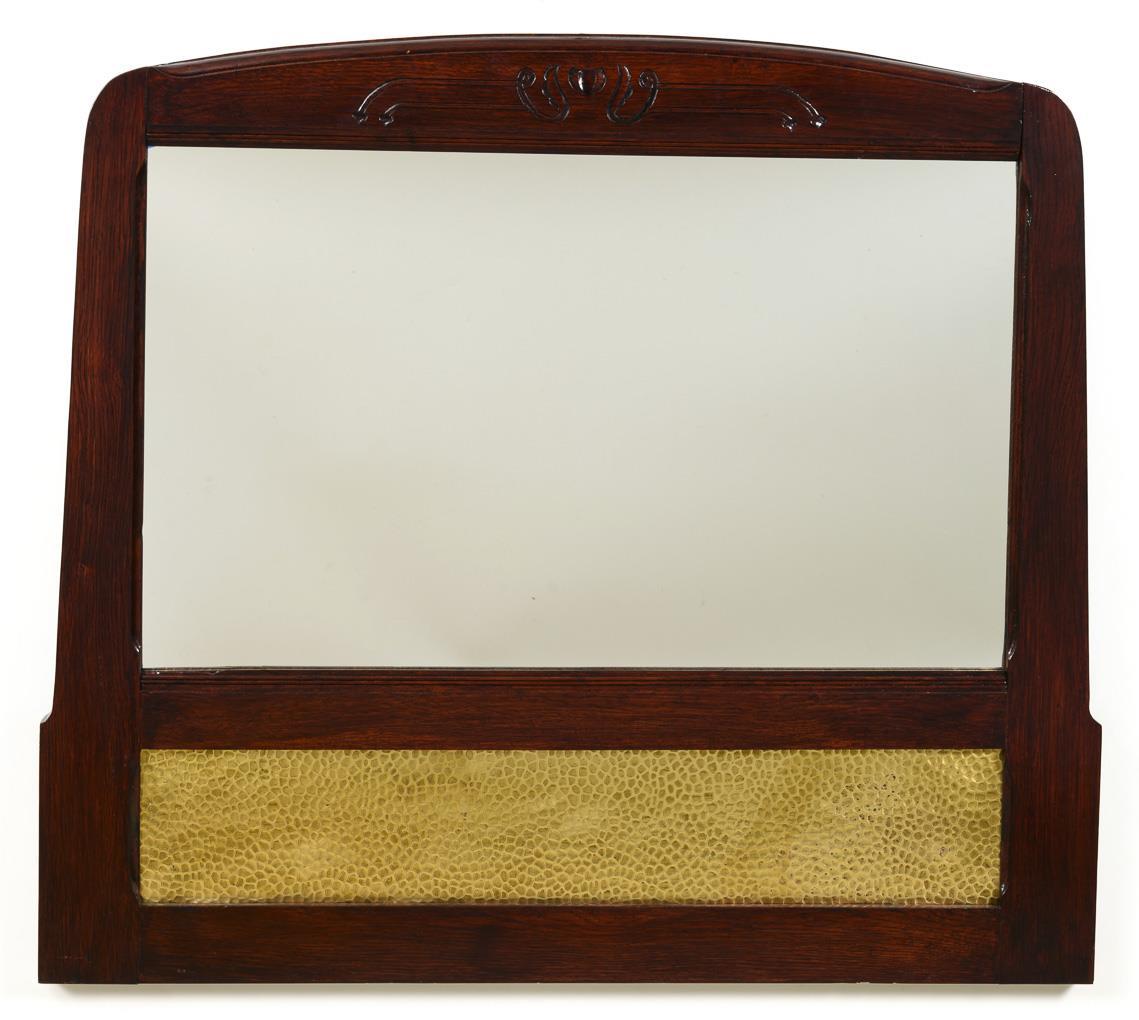Rechteckiger Wandspiegel mit leicht profiliertem Rahmen und stiltypischer Reliefornamentik, Sockelbereich mit eingesetzter gelber Glasscheibe in Martelé-Dekor, rückseitig mit Öse zur Aufhängung. Restauriert, Spiegelglas wohl ergänzt.