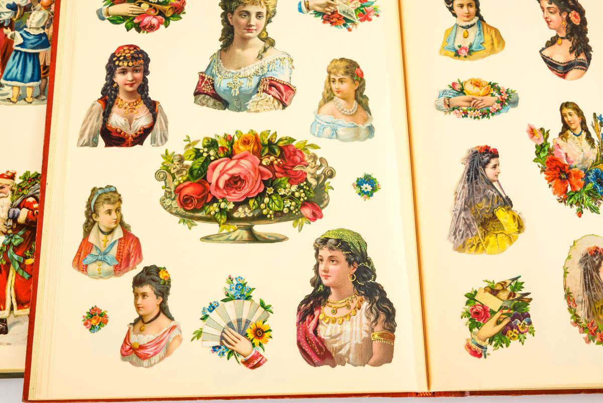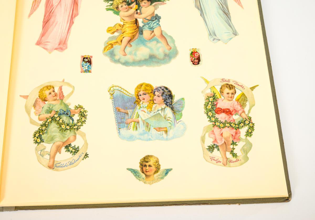 Alben mit mehrfarbigen Prägungen, 1x mit Farblithografie. Oblaten Farblithografien, häufig geprägt, 1x mit Glitzer. Album maximal 40 x 31 cm. Größte Oblate 35 x 29 cm.
