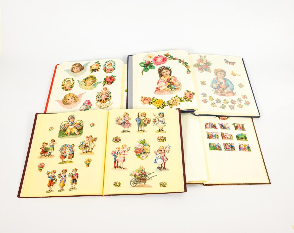 Alben mit Gold- bzw. Silberprägungen, 3x mit Farblithografien. Oblaten Farblithografien, häufig geprägt. Alben maximal 36 x 28 cm.