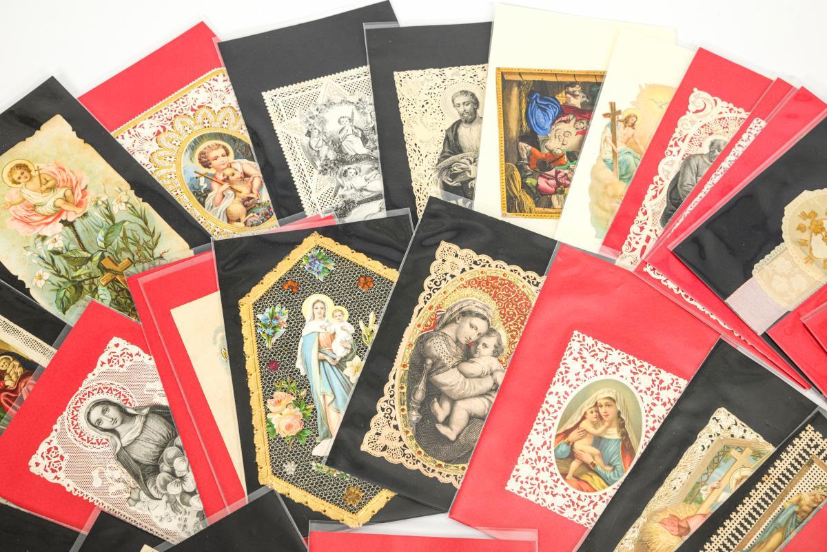 Zahlreiche Blumen, etliche Schutzengel, einige Marien- und Herz-Jesu-Darstellungen sowie christliche Symbole und Motive. Einige beschriftet, vereinzelt mehrsprachig. Papier teils gebräunt/stockfleckig.