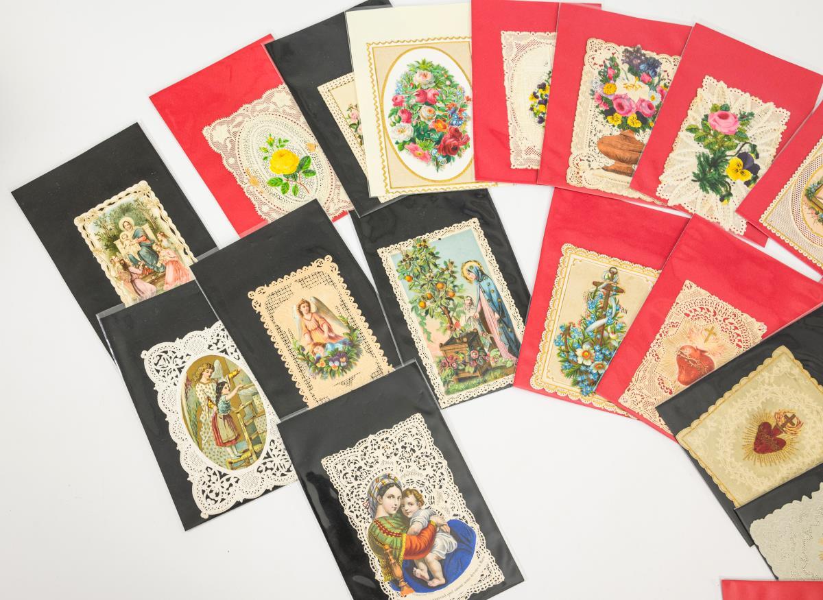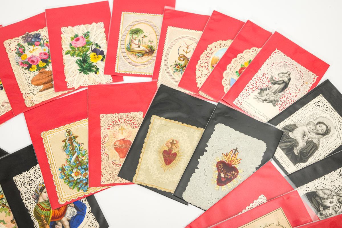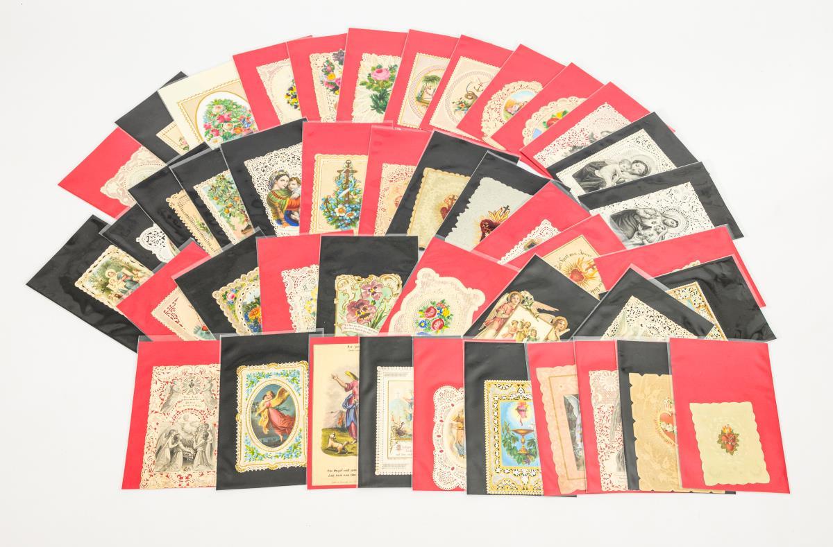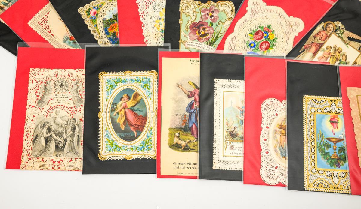 Farblithografien teils geprägt, Lithografien teils koloriert und gelegentlich goldstaffiert, Stanzspitze, Nadelstichbilder teils bemalt, vereinzelt mit Stoff. Maximal 13 x 9 cm.
