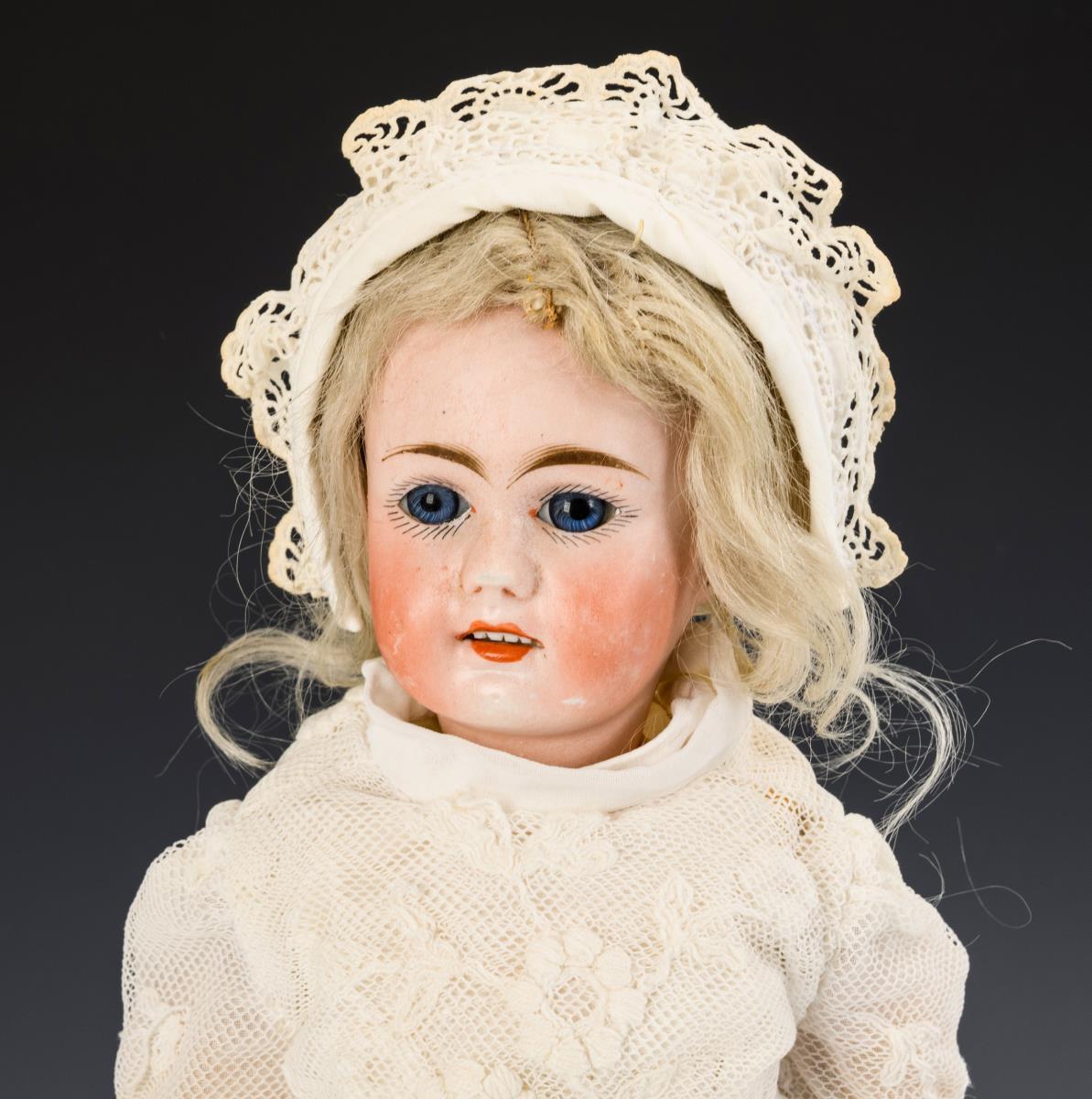 Beide mit Kurbelkopf, blauen Glasaugen, durchstochenen Ohrläppchen, Perücke, Kugelgelenkkörper, weißem Kleid, Haube und weißen Schuhen. Köpfe durchleuchtet: ohne Risse, lediglich kleinere Puppe mit beriebenen Wangen, 2 winzigen Chips an der Halskurbel und lose gespanntem Körper. Körper zum Teil bearbeitet.
