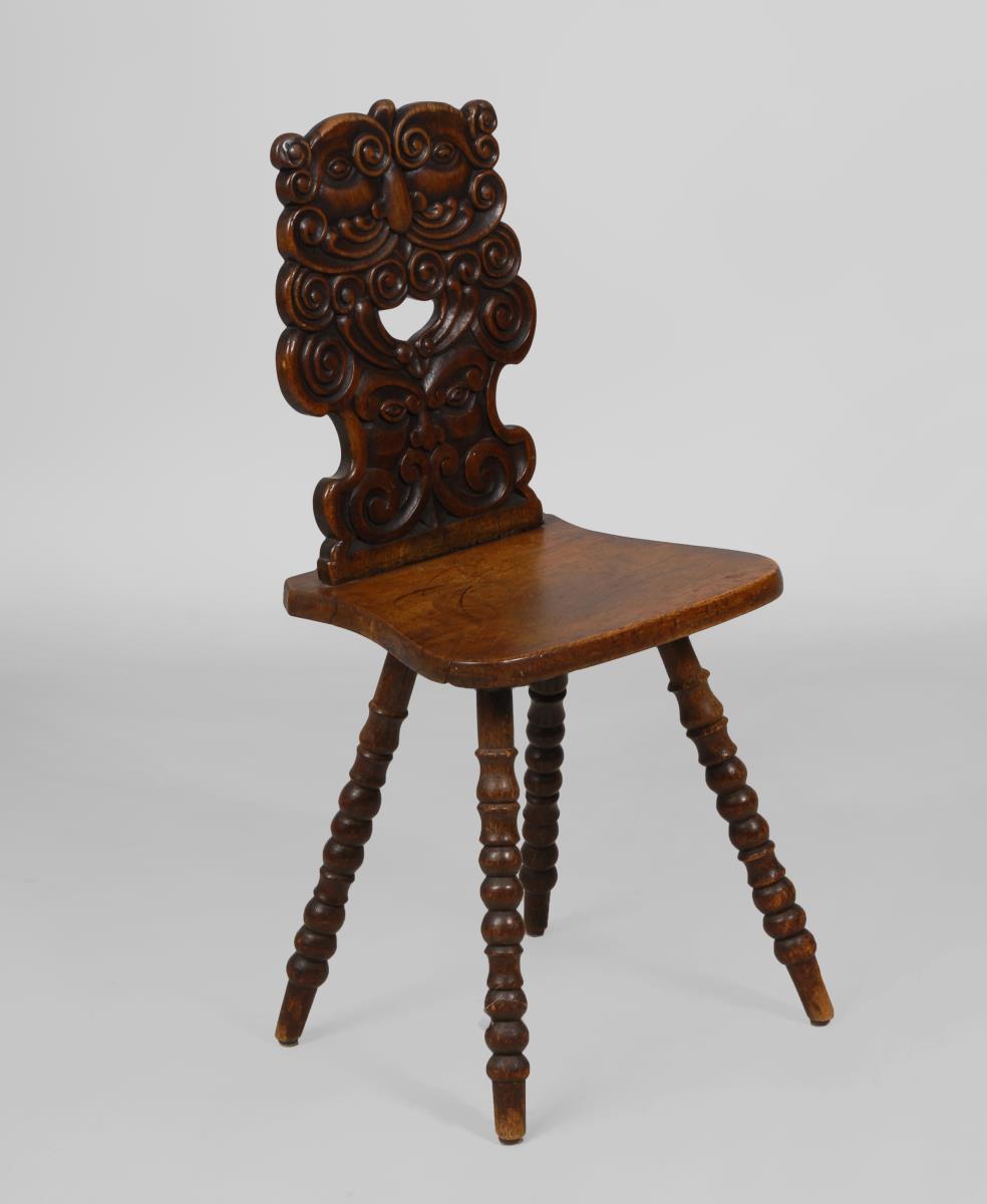 Brettstuhl mit üppig beschnitzter Rückenlehne in Form von grotesken Gesichtern auf 4 Drechsel-Beinen. Alters-/Gebrauchsspuren, restauriert.