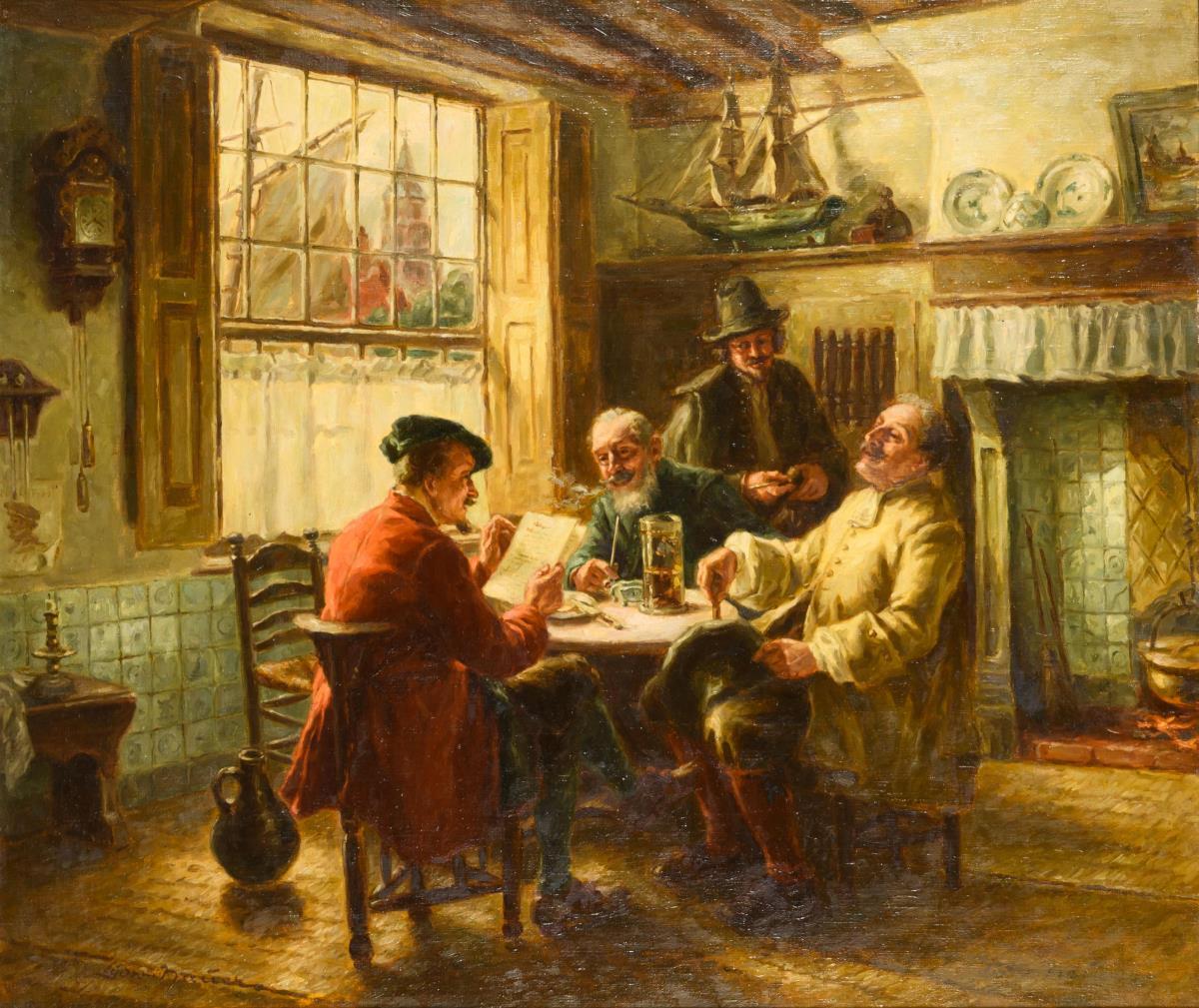 Vier Männer in der Kleidung des 17. Jahrhunderts im Gespräch über einem Brief an einem Tisch in der Stube. Leichte Altersspuren.