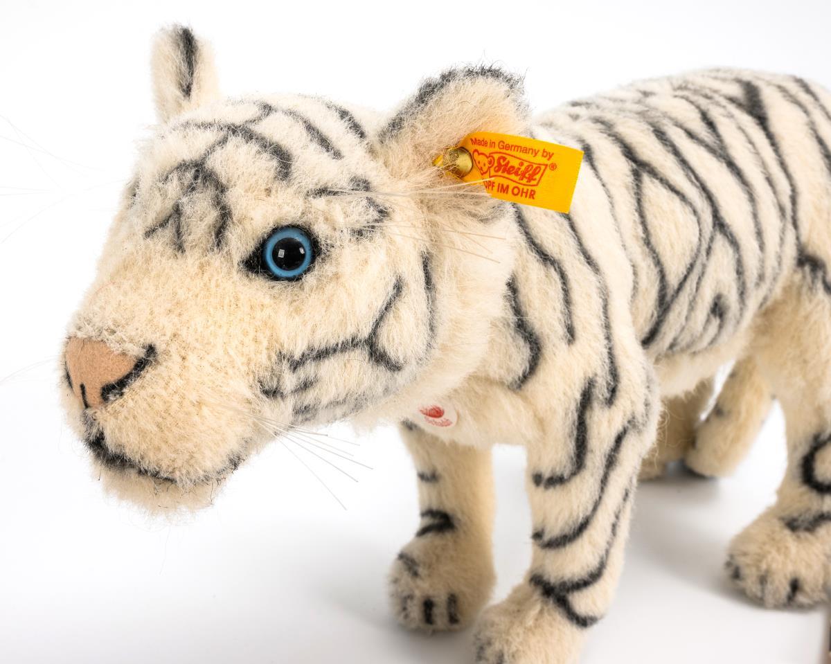 Großer weißer Tiger "Schadah" mit Originaletikett, großer liegender Leopard, 2 Leoparden-Babys, 4 Tiger, 3 Löwen und 2 Zebras. Kaum Altersspuren, einige mit späterer Bauchnaht.