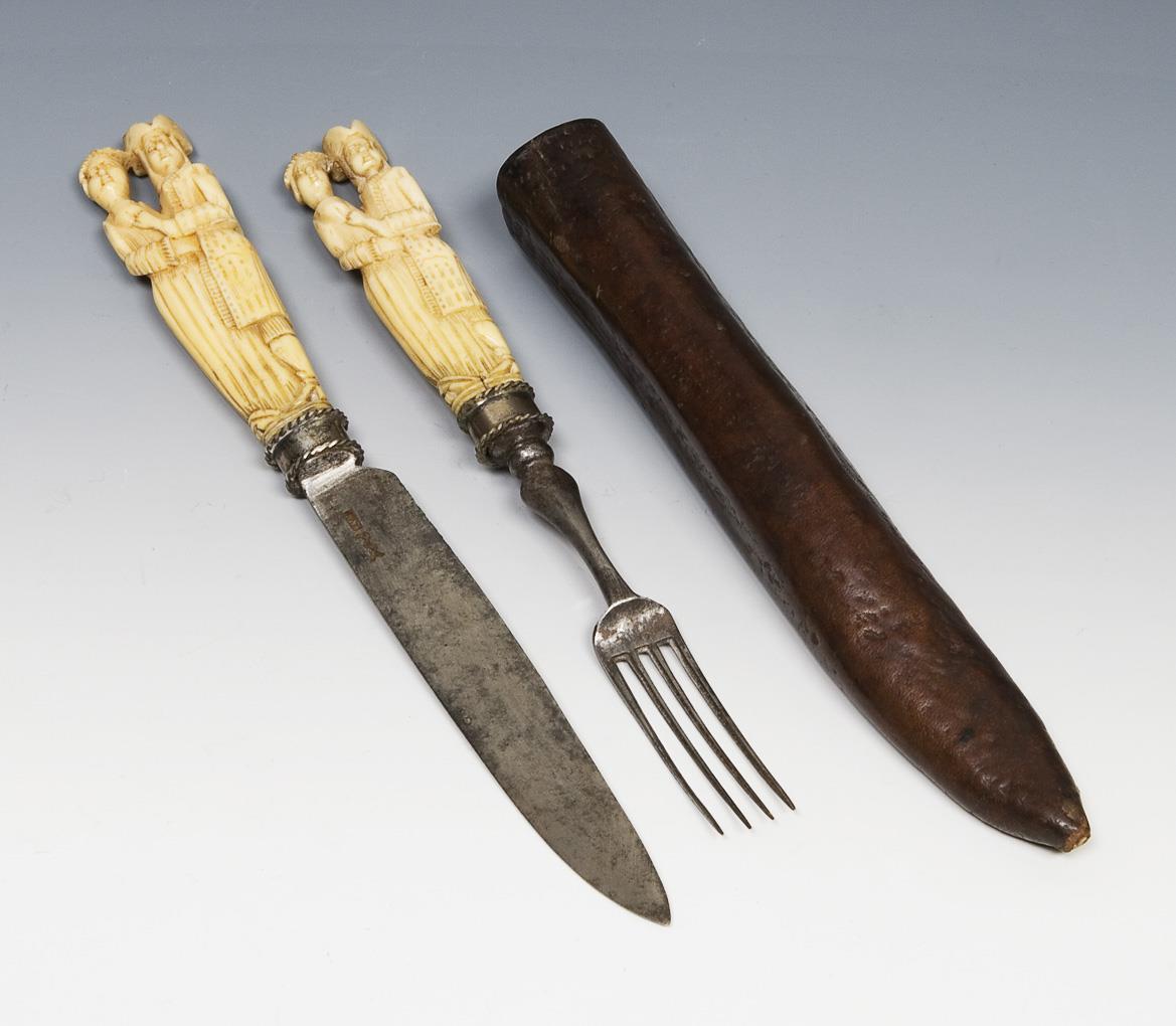 Griffe aus figürlich geschnitztem Knochen mit Liebespaar über Silber-Montierung, Klinge und Zinken aus Eisen mit Marken, Leder-Etui. Messergriff rückseitig gerissen, beschädigt.