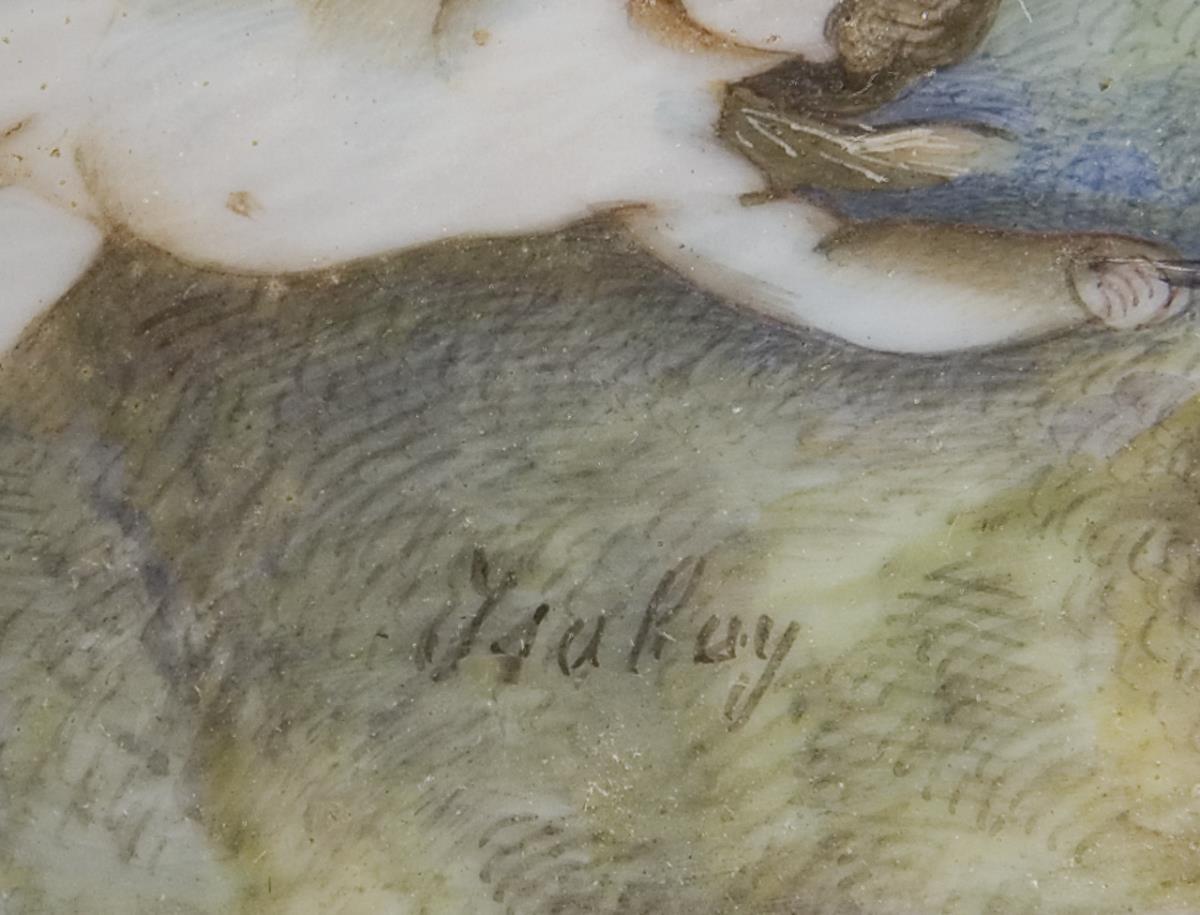 Schwarzer Korpus mit gekehlter Wandung, verglaster Deckel. Gouache, bezeichnet: Isabey. Kleiner Gemäldeausschnitt nach einer Gemälde-Vorlage von Francesco Albani (1578-1660, Bologna), Pinacoteca di Brera, Mailand.