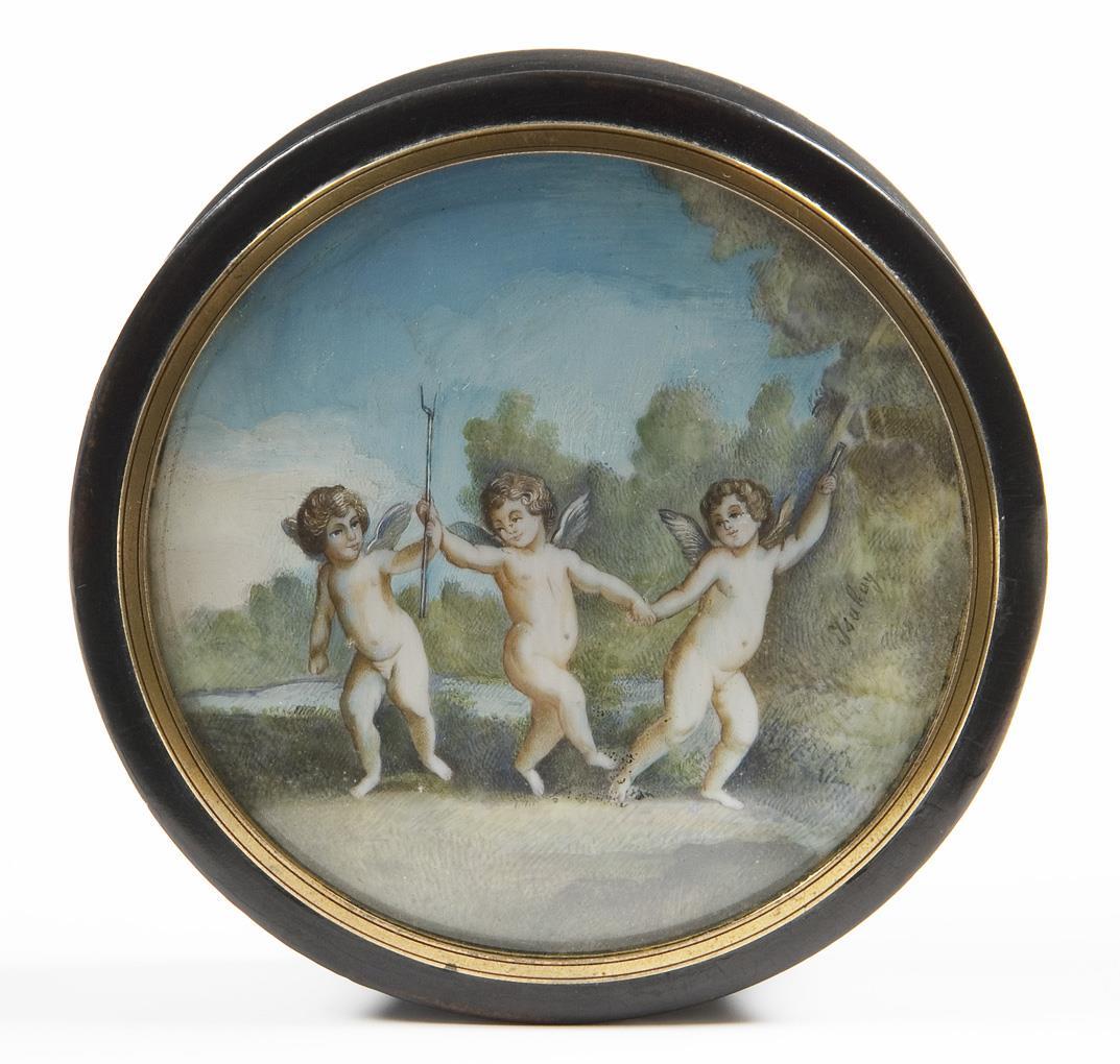Lack-Tabatiere mit Miniatur: Tanz der Amoretten.