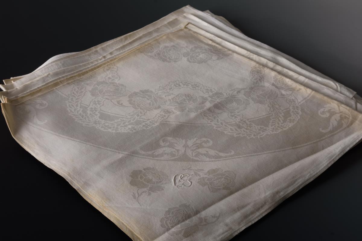 Tafeltuch und 11 Tischservietten mit Monogramm CG.
