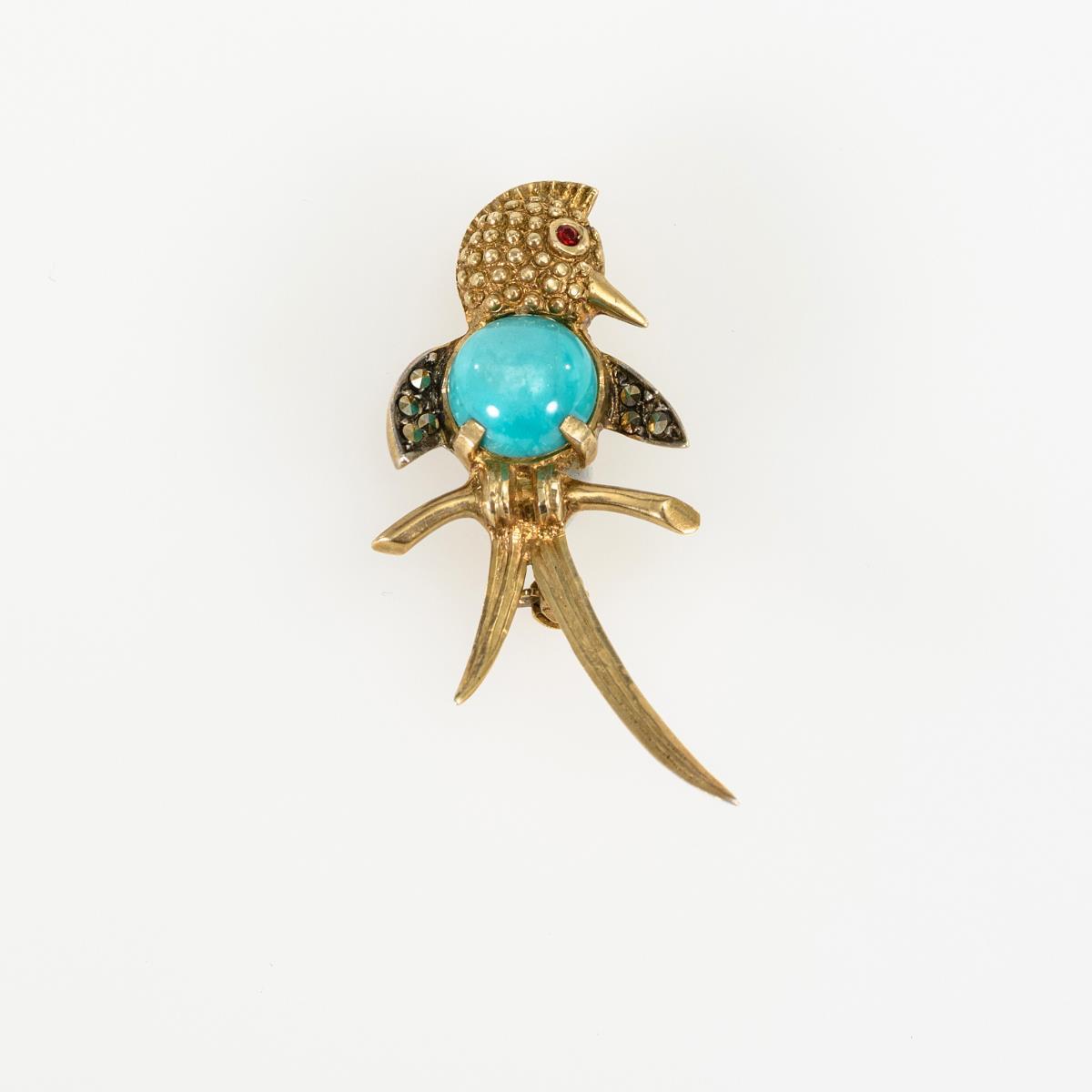 Vogel mit türkisfarbenem Cabochon, rotem Steinauge und Markasitenbesatz. Kugelhaken.