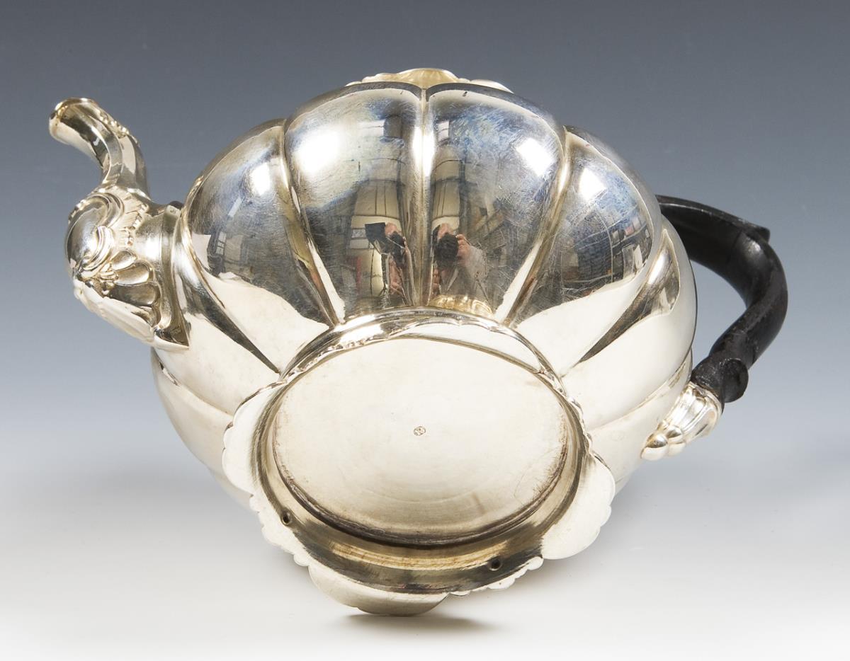 Getrieben und gegossen, vertikal godroniert, ornamental reliefiert, Rocaillen- und Muscheldekor. Scharnierdeckel mit montiertem Knauf, Punzen: Feingehalt. Henkel mit starken Gebrauchsspuren, Henkelmontierung provisorisch.