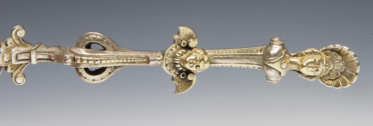 Getrieben und gegossen, beidseits ornamental reliefierte Stiele mit geflügelten Engelsköpfen, weiblichen Büsten, Maskarons und Muschelbekrönung. Geschweifte tiefgemuldete Laffen, Punzen: RC, Tremmulierstrich.