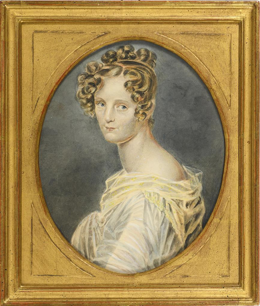 Bildnis einer Frau mit lockigem Haar und in transparenter Kleidung vor neutralem Hintergrund.