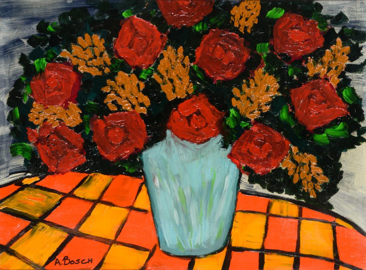 Farbkräftig und expressiv gemalter üppiger Blumenstrauß in hellblauer Vase auf kariert gedecktem Tisch.