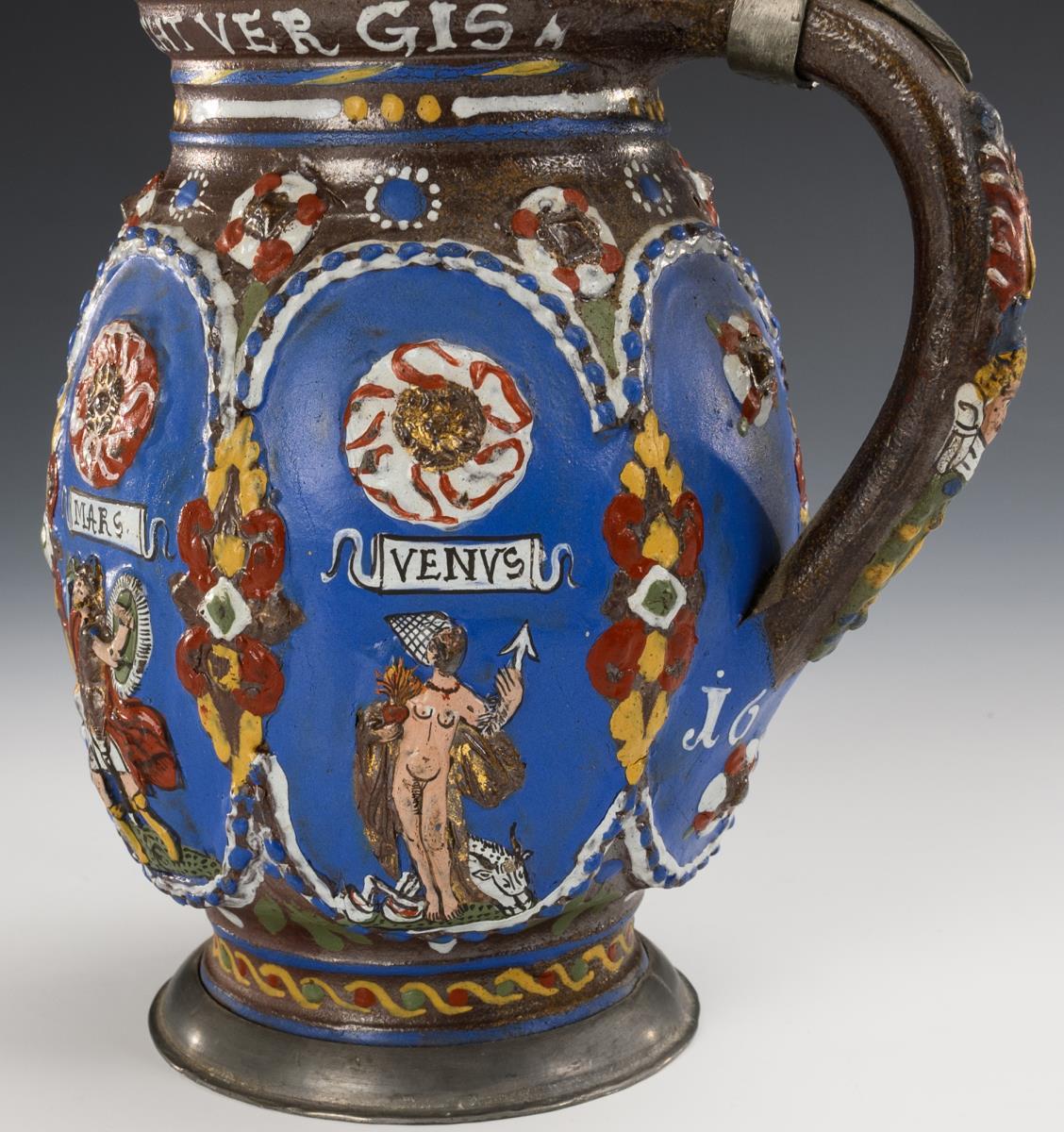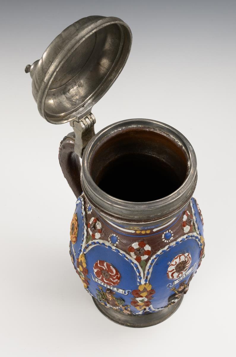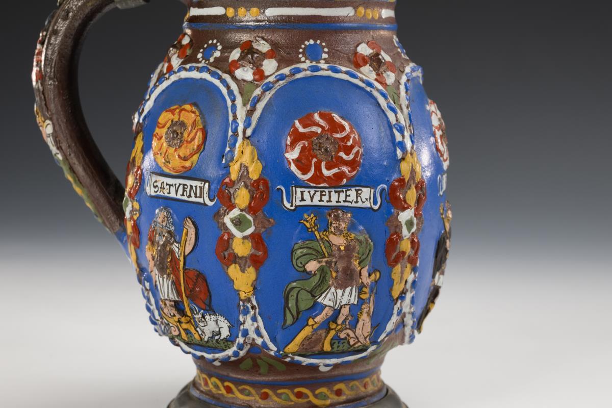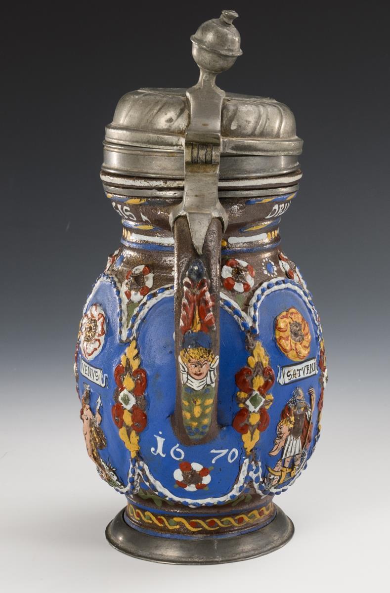 Reliefkrug mit sechsfach geplatteter Wandung, zylindrischem Hals und abgesetztem Stand, profilierter Bandhenkel. Auf der Wandung 6 blaue Reserven mit 5 bezeichneten Personifikationen der Planeten, verziert mit Kordelbändern, Blattwerk und aufgelegten Rosetten, am Hals ein Trinkspruch, unterhalb des Henkels datiert "1670". Godronierter Zinndeckel mit Gravur "CGB" und Kugeldrücker, innen alt handgraviert, Zinnbänder und Zinnstandring. Leichte Altersspuren, teils glasur- und goldberieben, an Hals ein feiner Mündungsriss, Zinndeckel verbogen.