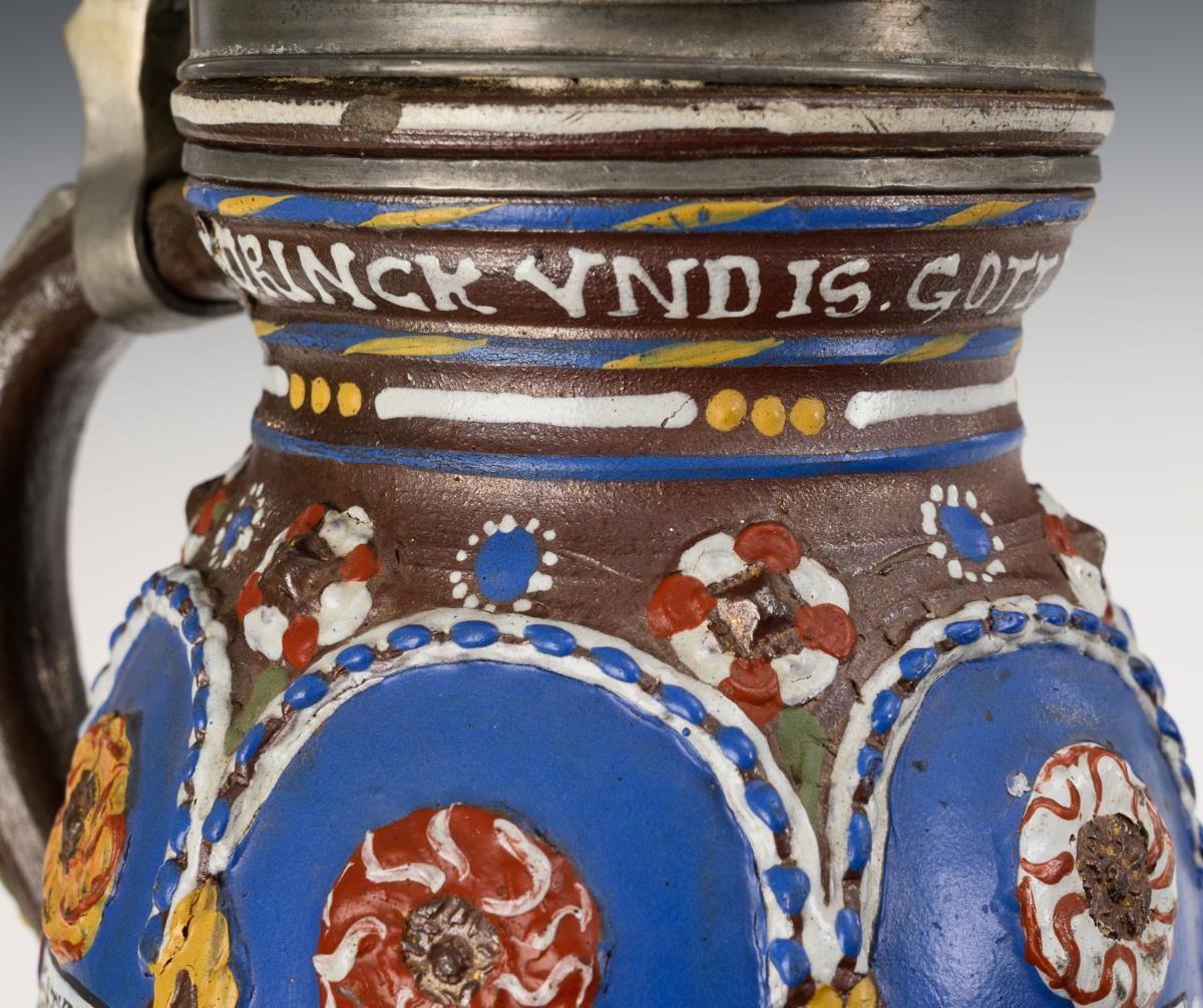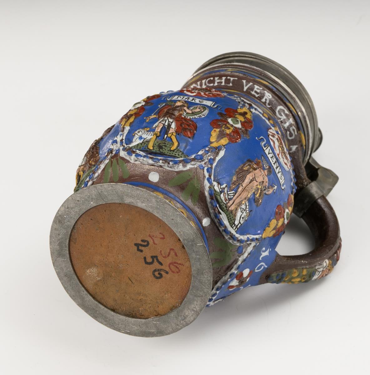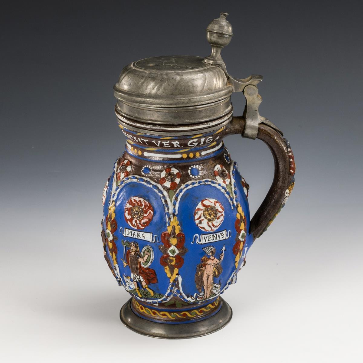 Reliefkrug mit sechsfach geplatteter Wandung, zylindrischem Hals und abgesetztem Stand, profilierter Bandhenkel. Auf der Wandung 6 blaue Reserven mit 5 bezeichneten Personifikationen der Planeten, verziert mit Kordelbändern, Blattwerk und aufgelegten Rosetten, am Hals ein Trinkspruch, unterhalb des Henkels datiert "1670". Godronierter Zinndeckel mit Gravur "CGB" und Kugeldrücker, innen alt handgraviert, Zinnbänder und Zinnstandring. Leichte Altersspuren, teils glasur- und goldberieben, an Hals ein feiner Mündungsriss, Zinndeckel verbogen.