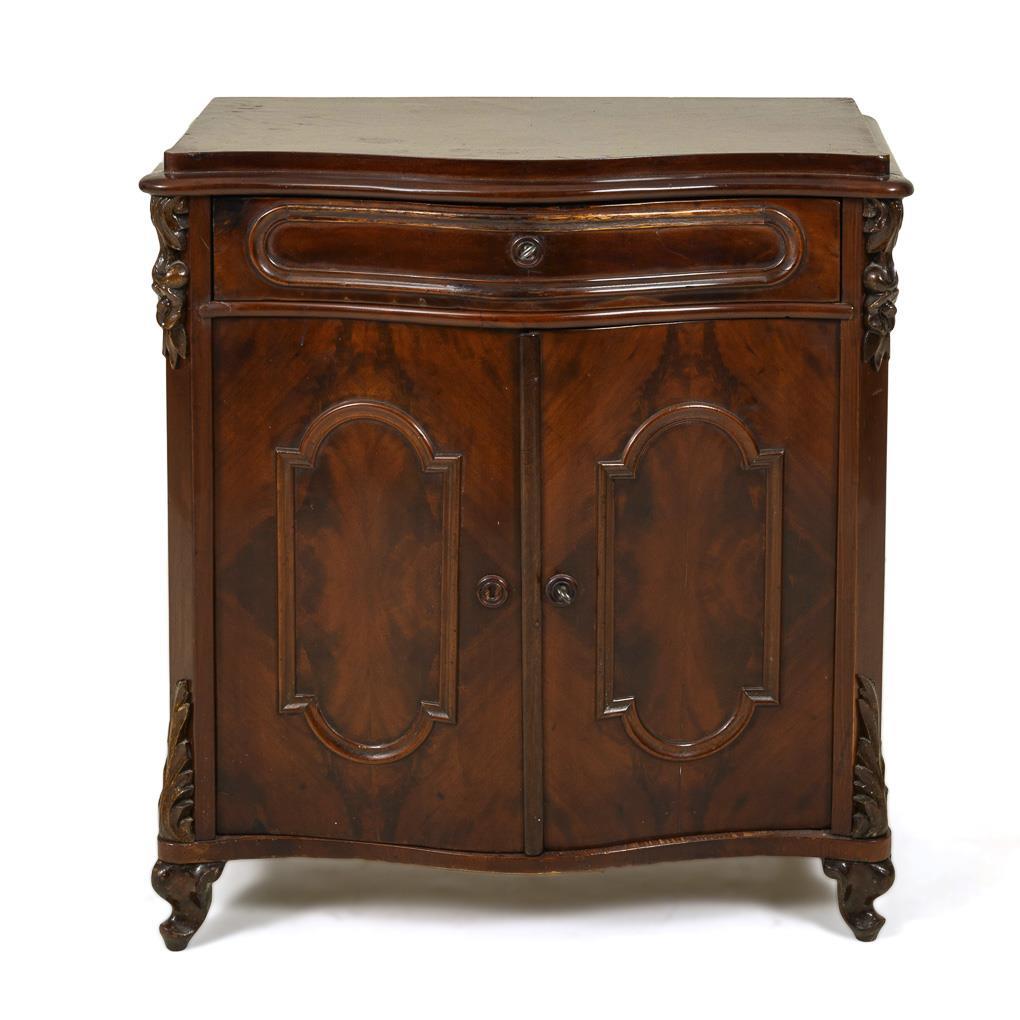 2-türiger Unterschrank mit Kopfschub, geschweifte Front, profilierte Deckplatte, geschrägte Ecken mit floraler Schnitzzier, aufgelegte Profilleisten, auf 2 floralen Füßchen und 2 hinteren Klotzfüßen. Runde Schlüssellochbeschläge aus Holz, Messingschlösser, 2 Einlegeböden. Alt restauriert, mit Ergänzungen, partiell Defekte und Gebrauchsspuren.