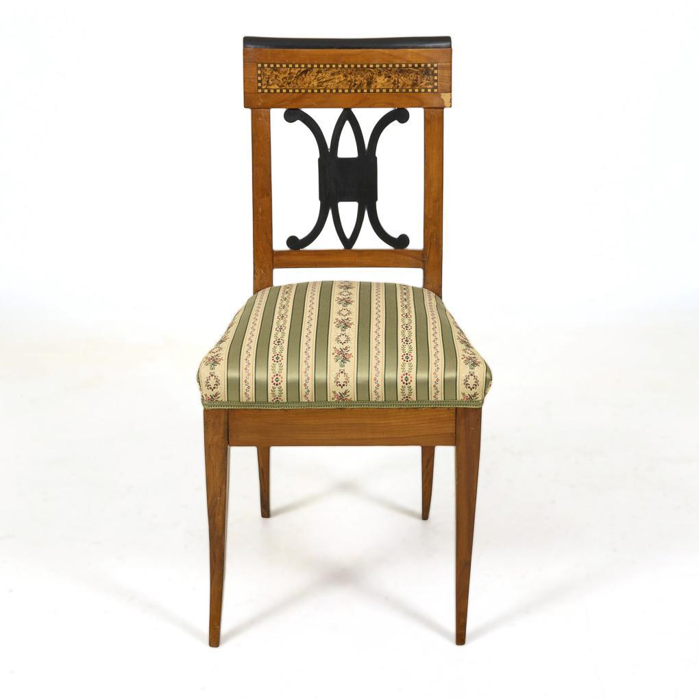 Rückenlehne mit geradem Schulterbrett, darin eine Maserholz-Scheinkassette mit Schachbrettrahmung, ornamentaler Mittelsteg, konische Polstersitzfläche mit Jacquard-Streifenstoff, auf 4 leicht geschwungenen Spitzbeinen. Restauriert, 1 Furnierdefekt, leichte Alters- und Gebrauchsspuren.