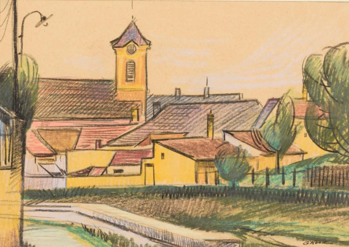 Dicht stehende Häuser vor Kirche unter hellem Himmel.