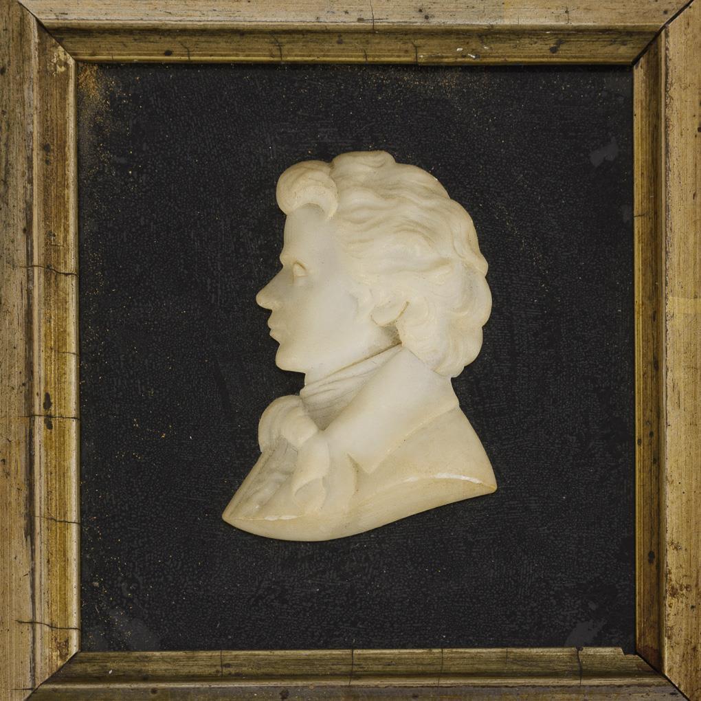 Bildnisrelief des "Arthur Maynard Denny" (1823-1900) im Silberrahmen mit Schleifenbekrönung und Hängeöse sowie verso Namensgravur. / Porträt eines jungen Mannes im Leistenrahmen. 1x Porzellan etwas gebräunt und geringe Farbschäden am Glasträger und Rahmen.