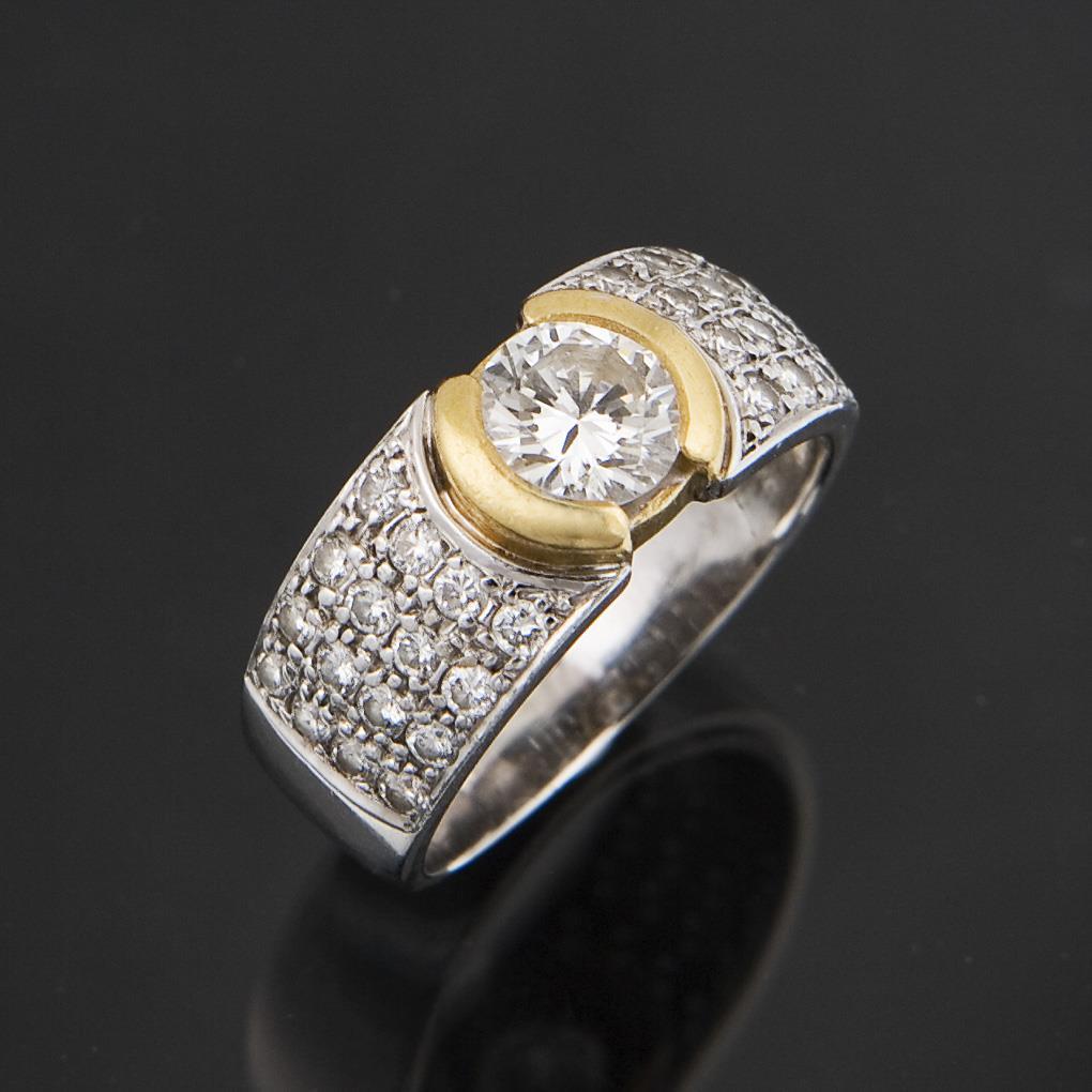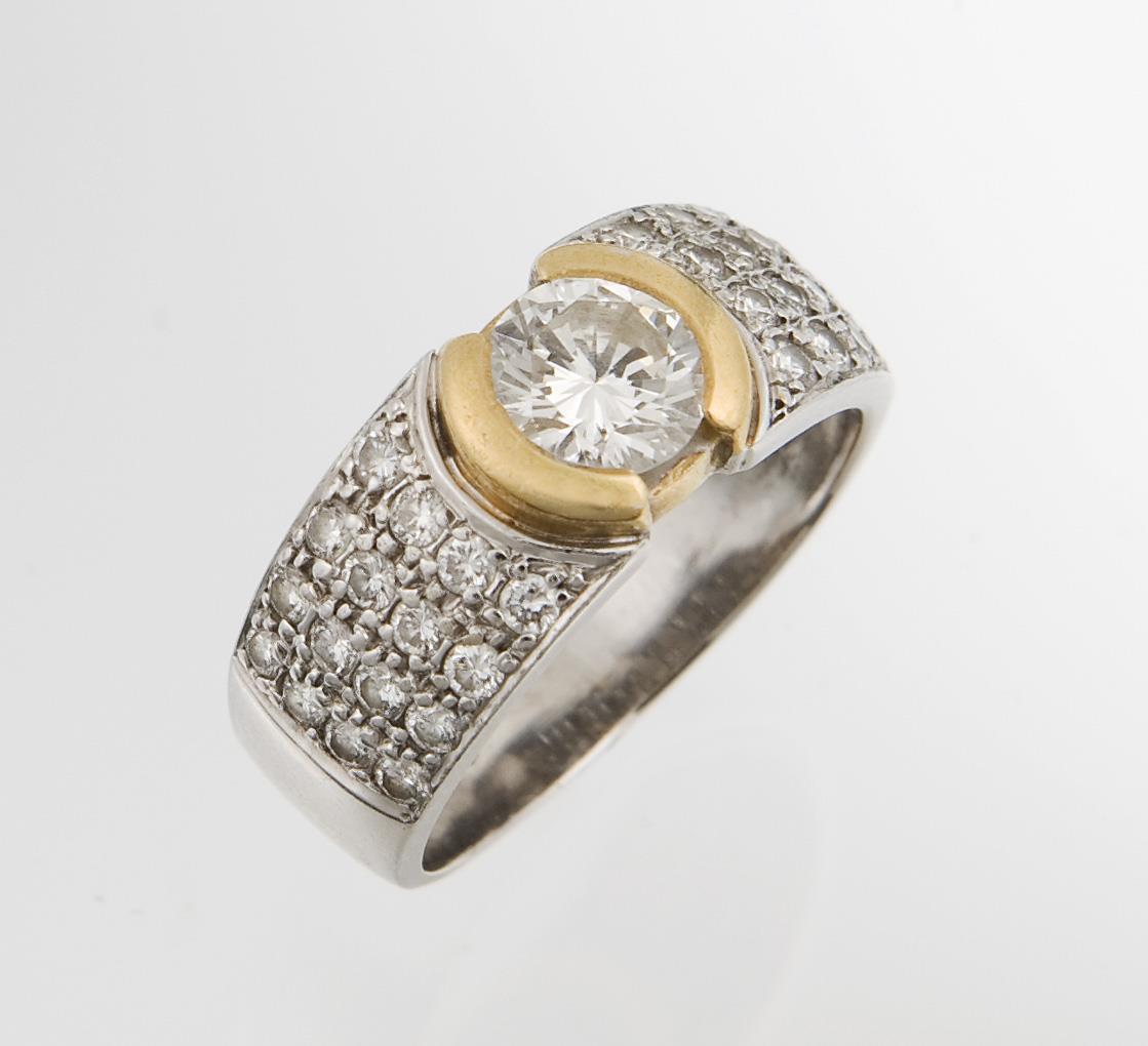 Zentral Brillant circa 1 ct mit guter Brillanz, seitlich 32 kleine Diamanten circa 0,5 ct, breite stabile Schiene. Undeutliche Punze, Feingehalt mit Säure geprüft.