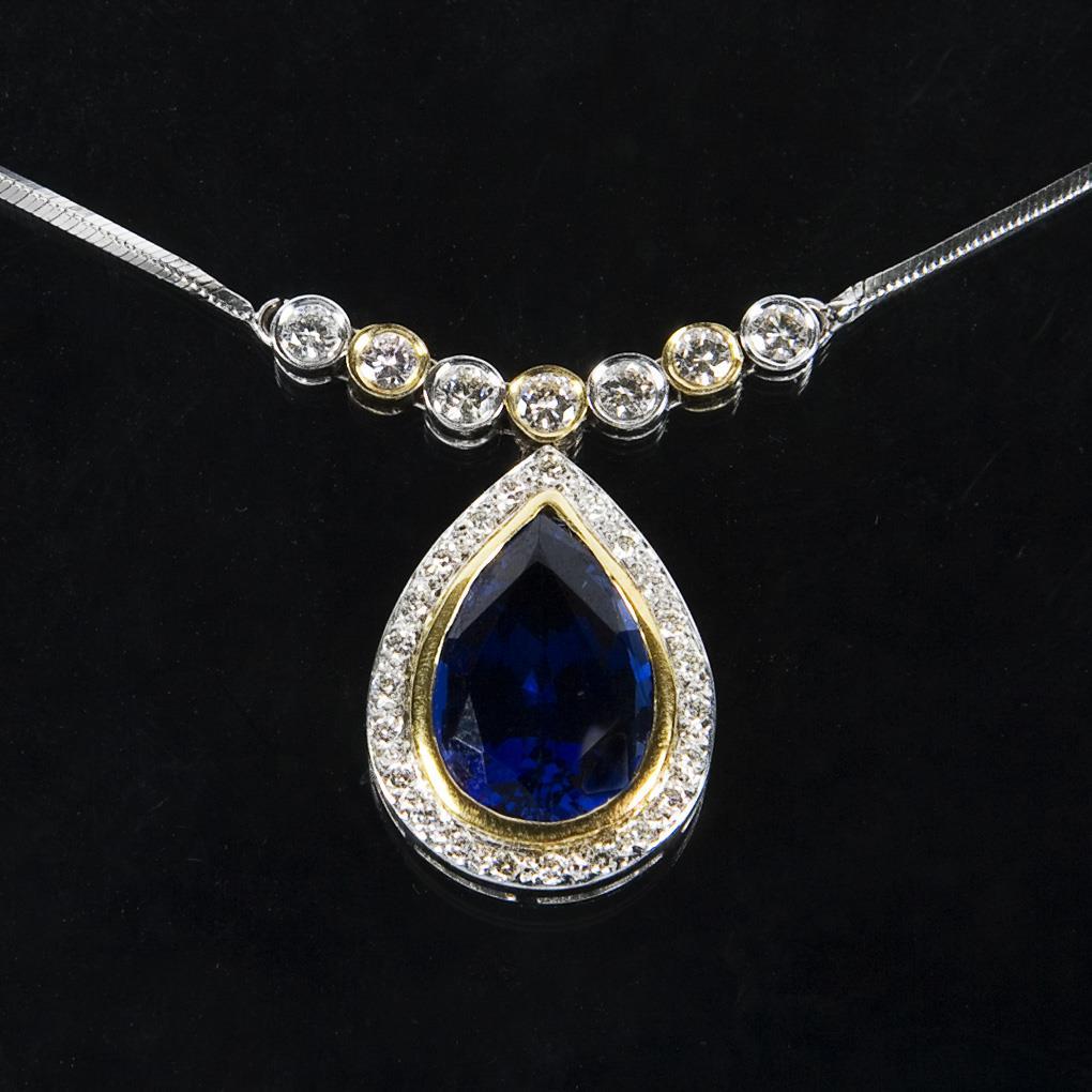 Tiefblauer facettierter Lazulith in Tropfenform, 7 kleine Brillanten circa 0.35 ct, zahlreiche kleine Diamanten. Grazile Kette mit kleinem Karabiner. Punzen: Feingehalt, Juweliermarke Midas.