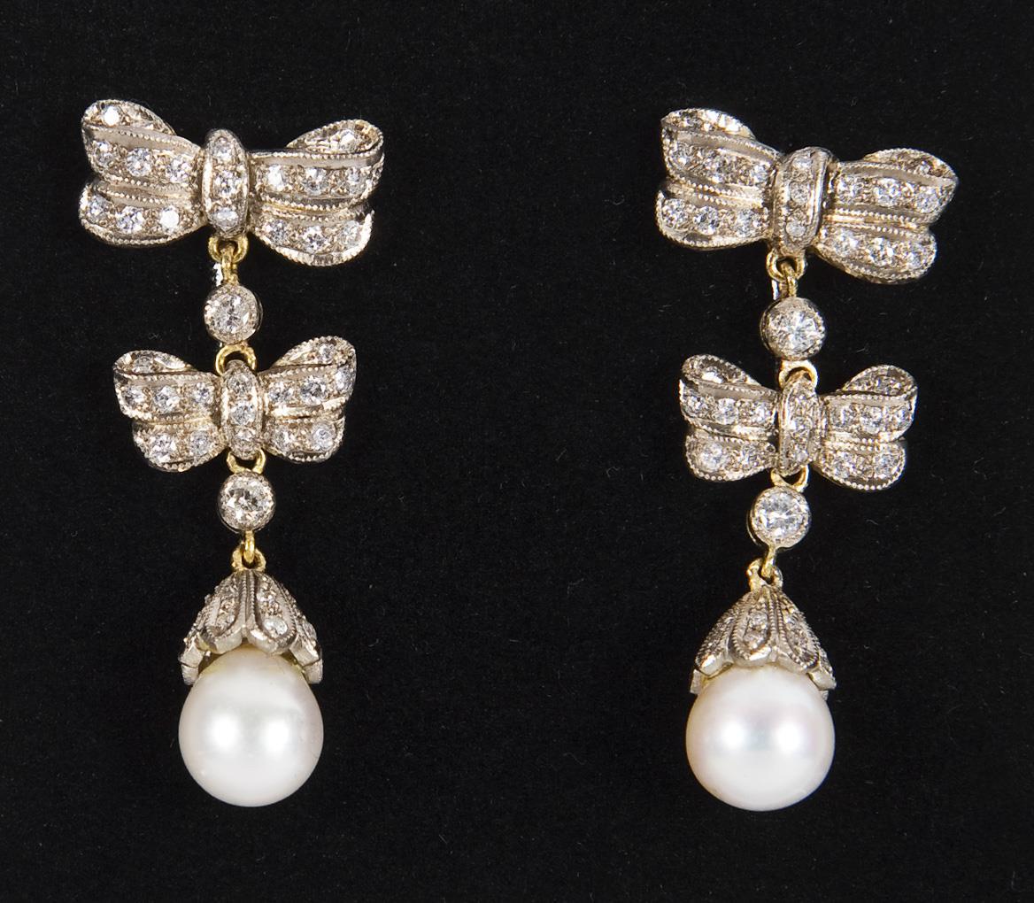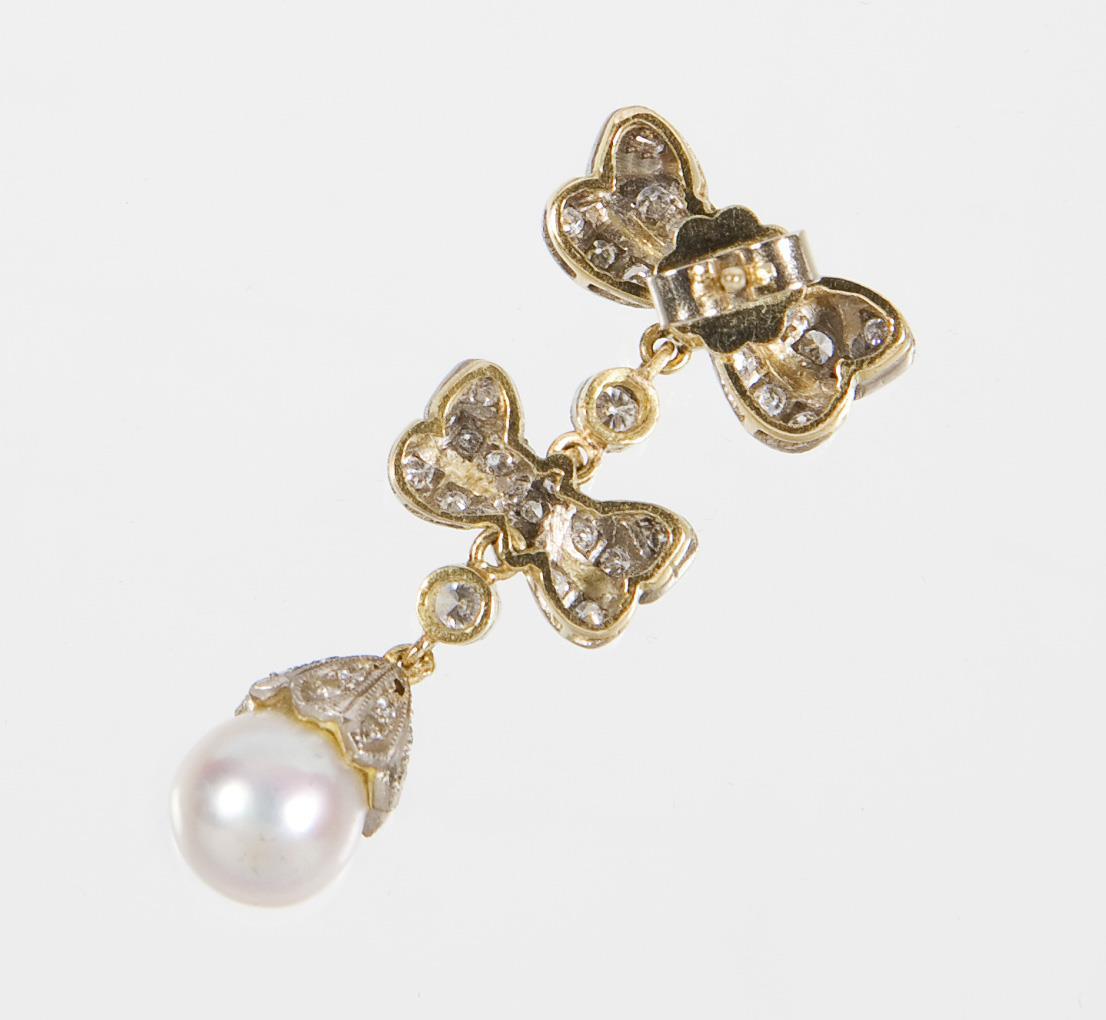 2 Zuchtperlen ø 7,5 mm, zahlreiche kleine Diamanten, Ohrstecker mit Schleifendekor und beweglichen Abhängungen, Punzen: Feingehalt. An einer Perlenmontierung kleine Löchlein.