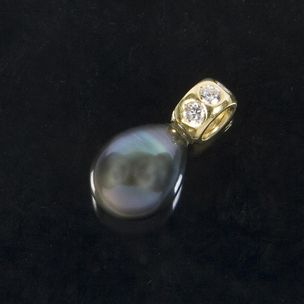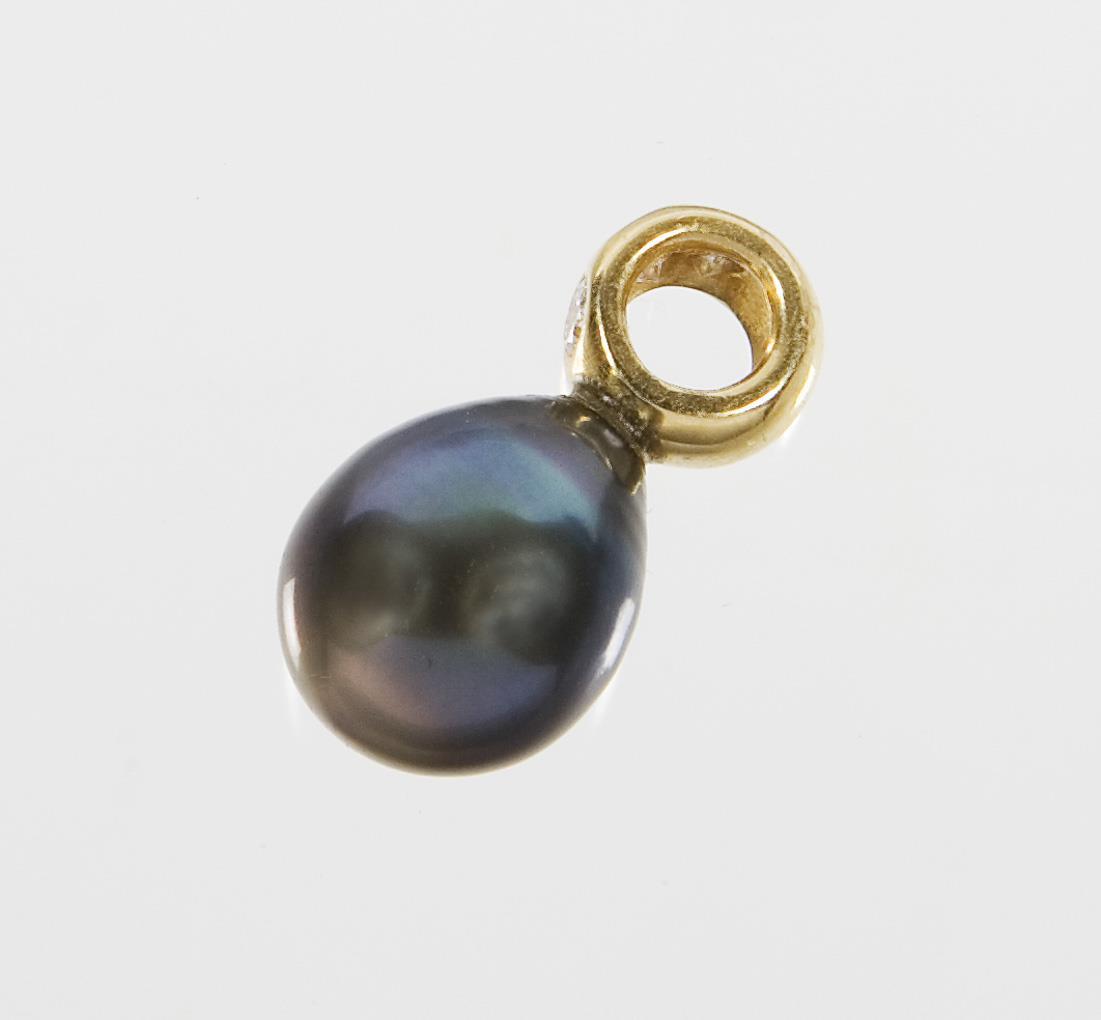 Tropfenförmige Tahiti-Zuchtperle mit gutem Lüster circa 12 mm, 3 kleine Brillanten, ohne Punzen, Feingehalt mit Säure geprüft.