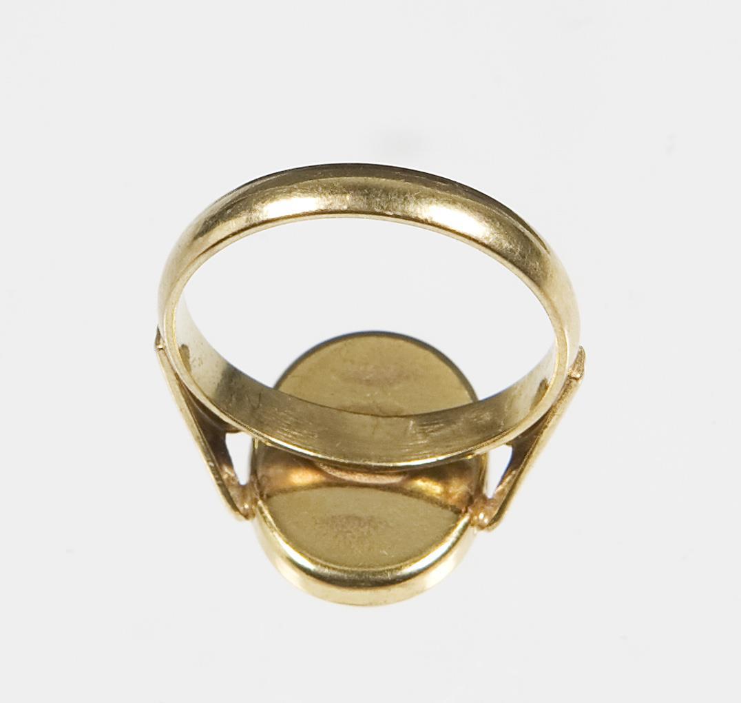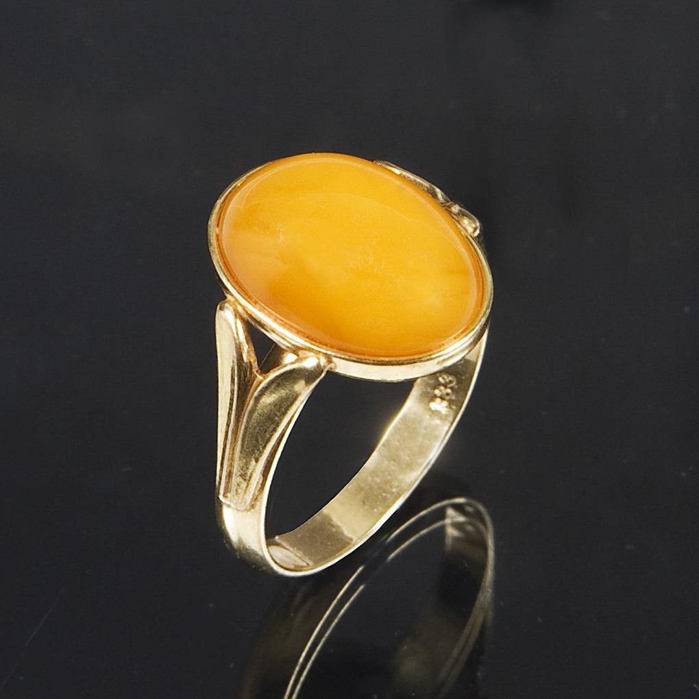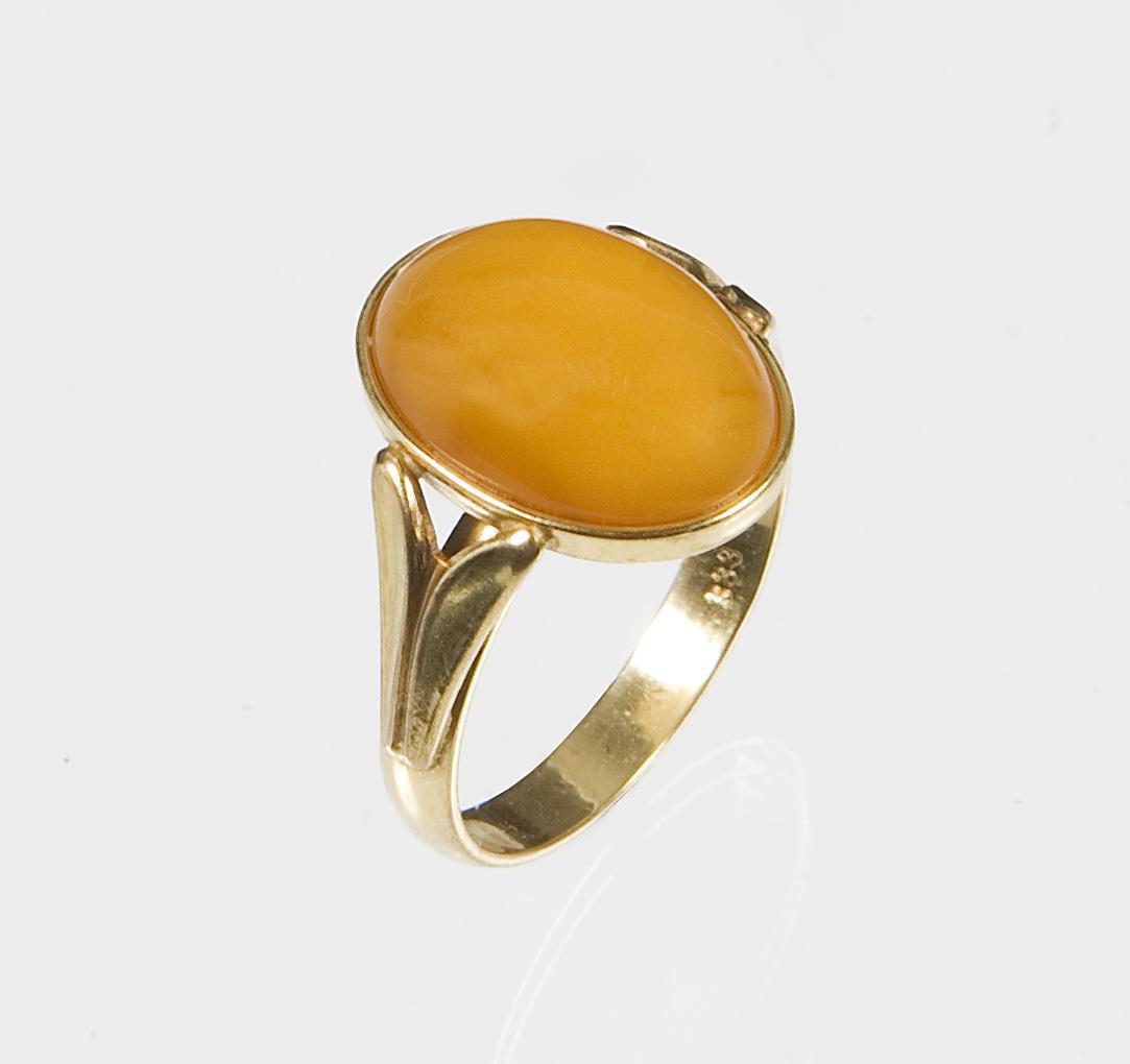Ovaler Bernstein-Cabochon circa 14 x 10 mm in Zargenfassung, stabile Schiene, Punzen: Feingehalt.