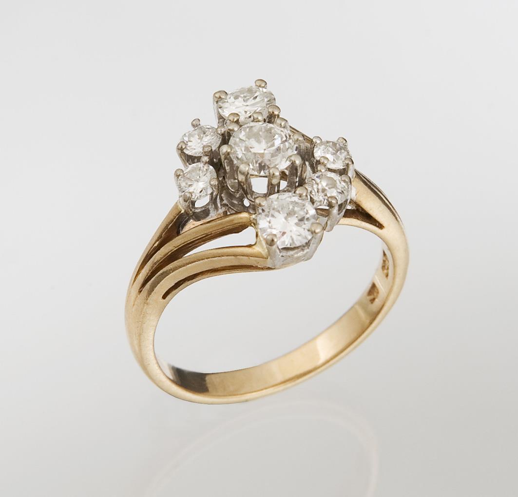 Durchbrochen gearbeitete Schultern, 7 Brillanten von guter Qualität in Krappenfassungen 1,15 ct. Stabile Schiene, Punzen: Feingehalt, Juweliermarke, Brillant-Karat eingraviert.