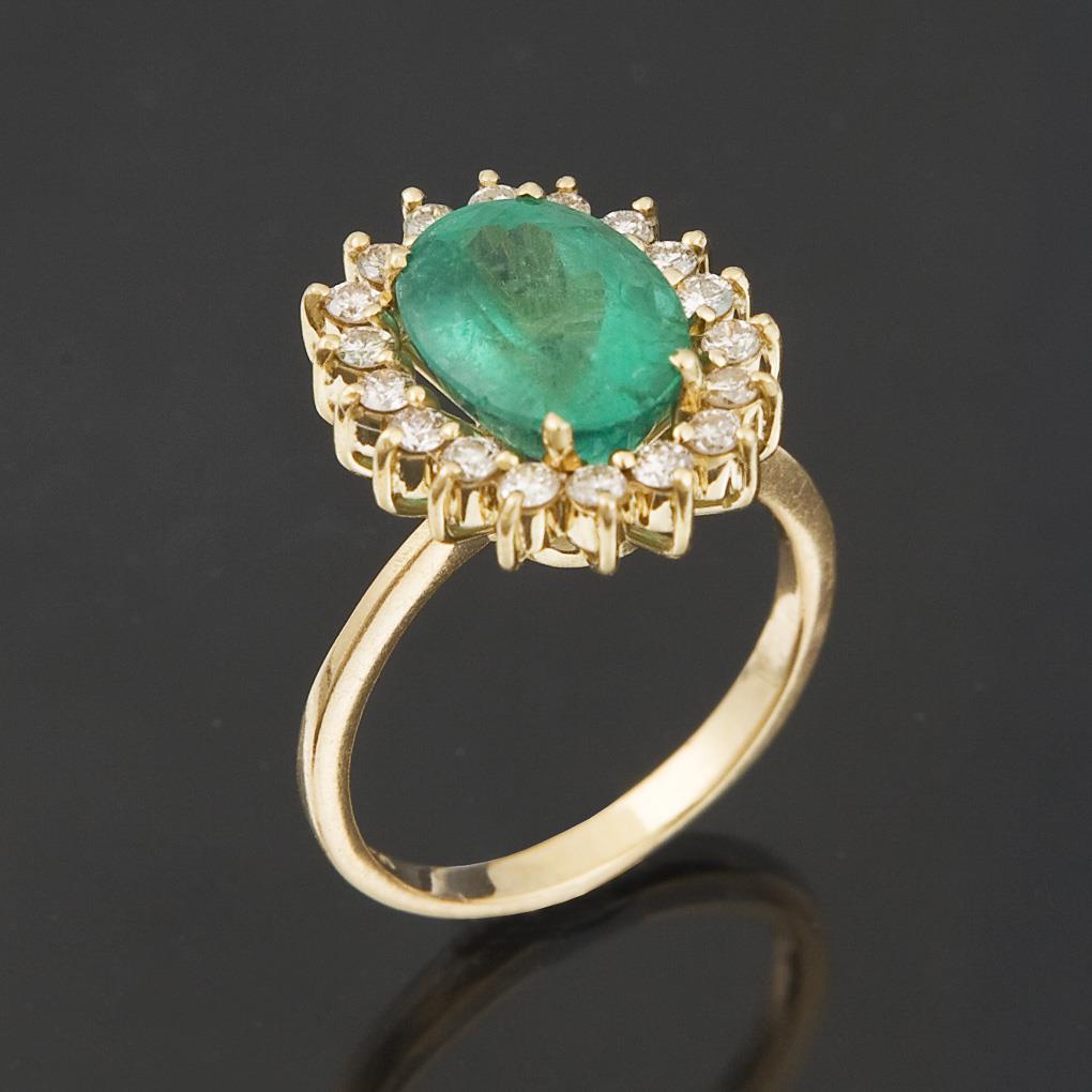 Facettierter Smaragd circa 10,5 x 7,7 mm, umlaufend 18 kleine Brillanten in Krappenfassungen, stabile Schiene, Punzen: Feingehalt.