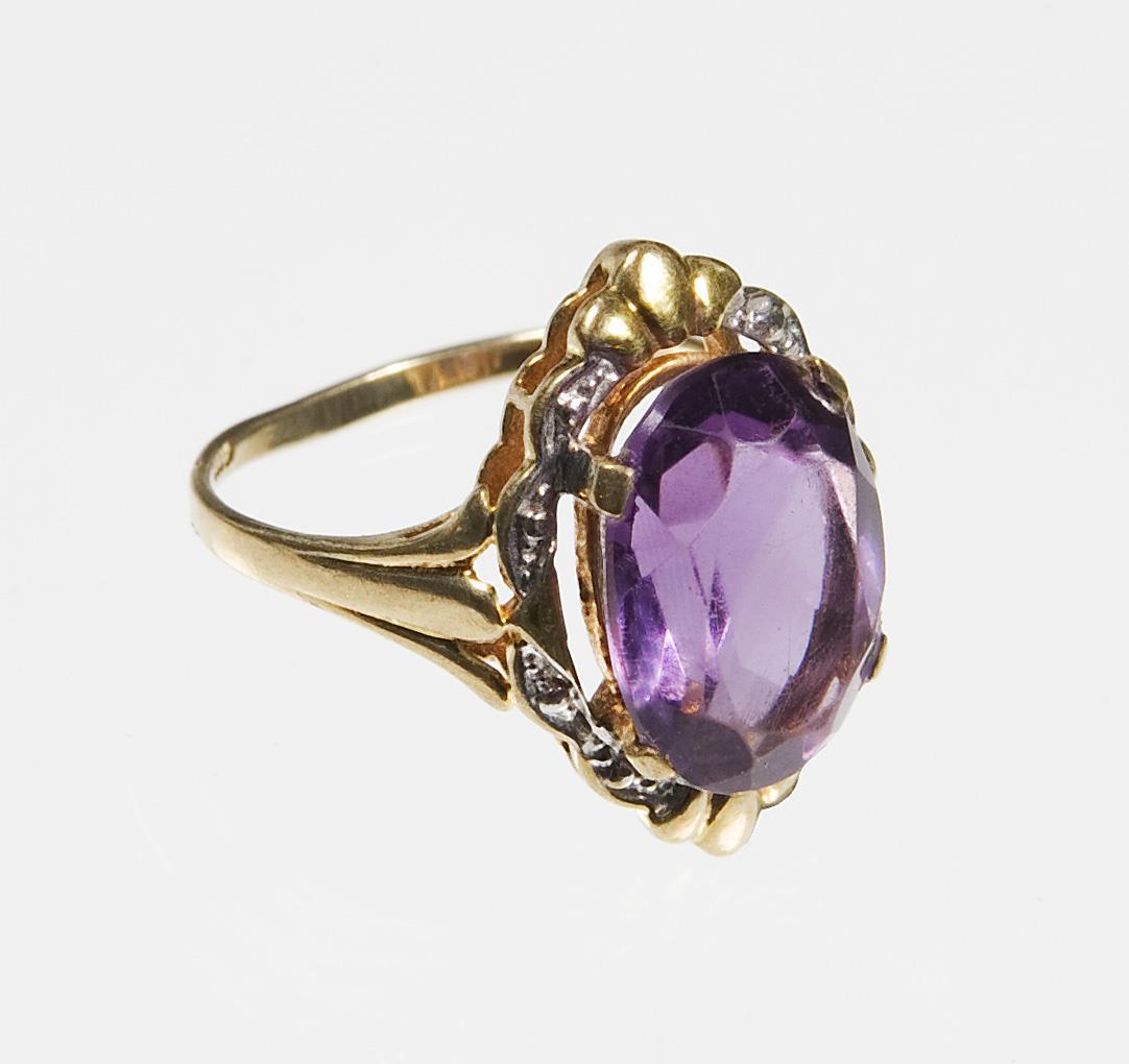 Ovaler facettierter Amethyst 14 x 10 mm in Krappenfassung, grazile Schiene, Punzen: Feingehalt. Gebrauchsspuren.