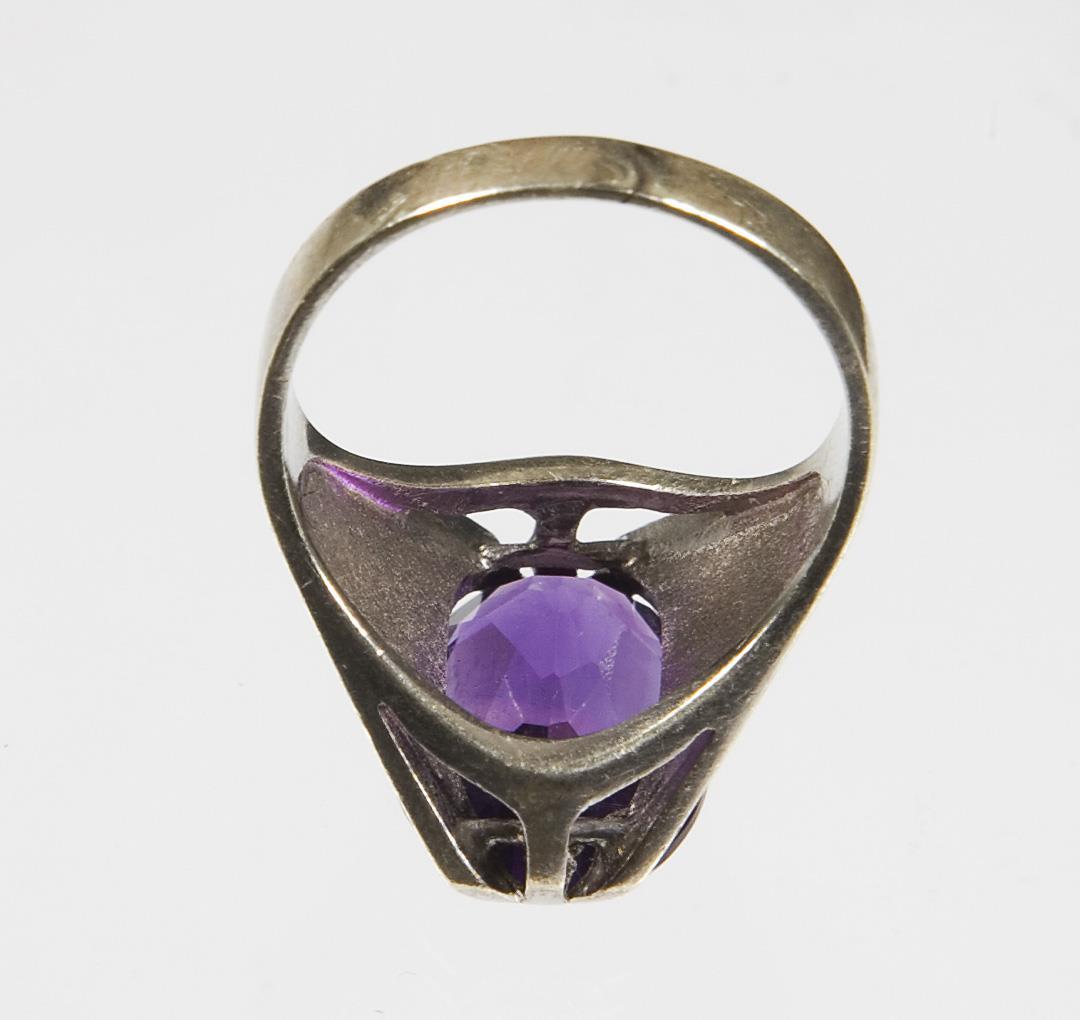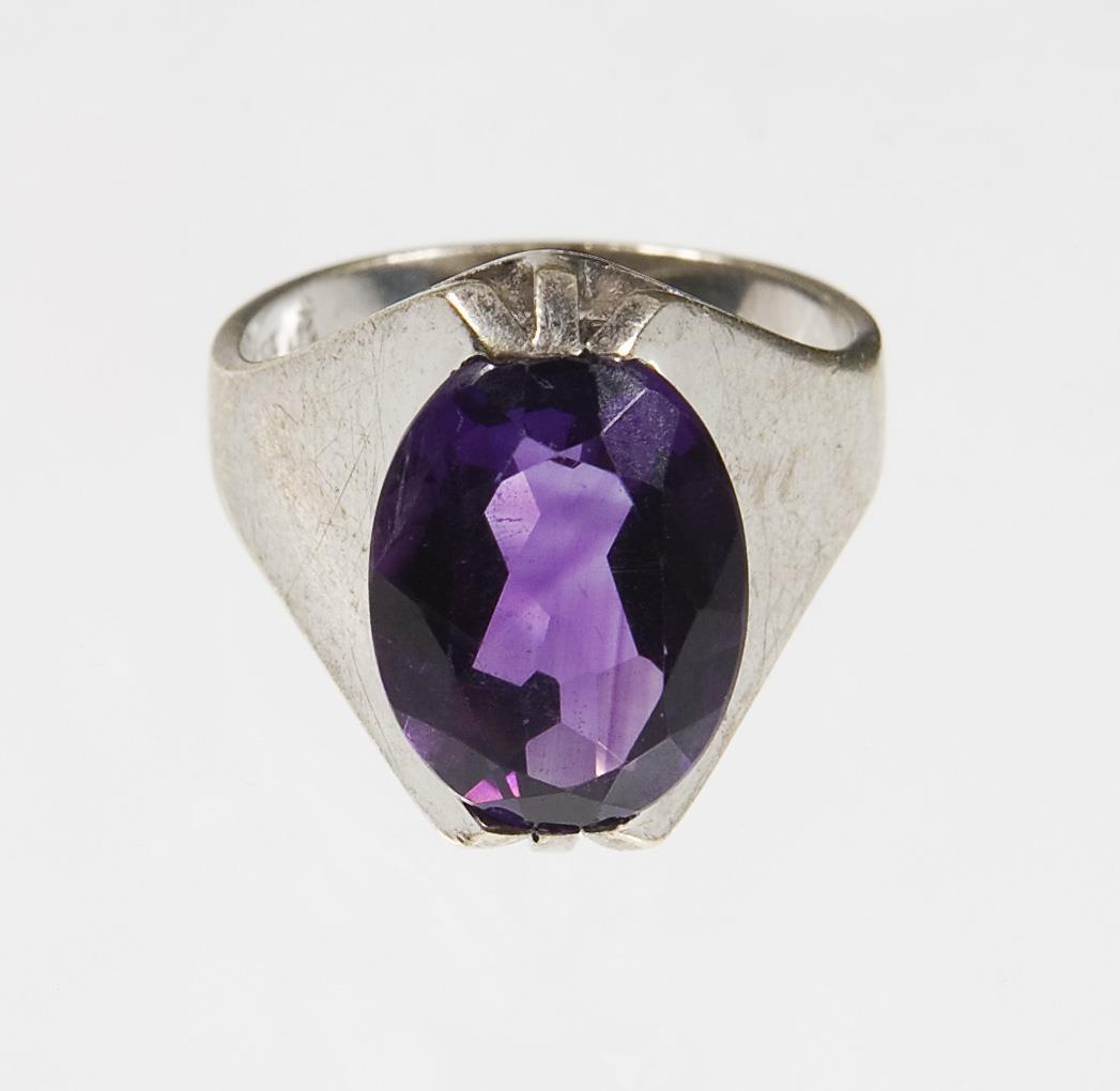 Ovaler facettierter Amethyst 13 x 10 mm, glatte Schiene, Punzen: Feingehalt, Juweliermarke von Heinrich Haupt, Goldwarengroßhandlung in Düsseldorf. Schiene restauriert.