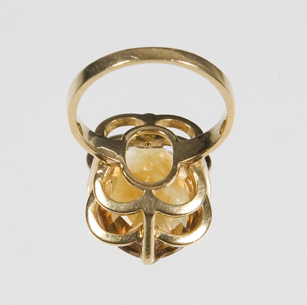 Hochgewölbte Form, durchbrochen gearbeitet, ovaler facettierter Citrin circa 15,5 x 12 mm in Krappenfassung, stabile Schiene, Punzen: Feingehalt, Juweliermarke.