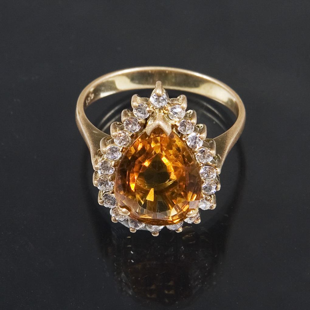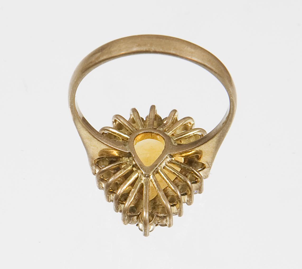 Tropfenförmiger facettierter Citrin, Länge circa 12,7 mm, umlaufend zahlreiche kleine Zirkone in Krappenfassungen, schmale Schiene, Punzen: Feingehalt.