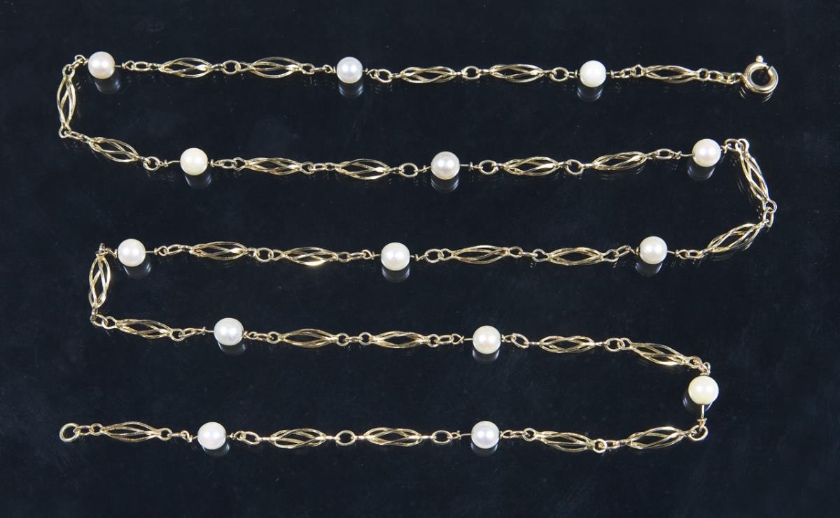 Grazile Kette mit Federring, 14 Perlchen, Punzen: Feingehalt, Juweliermarke FBM.
