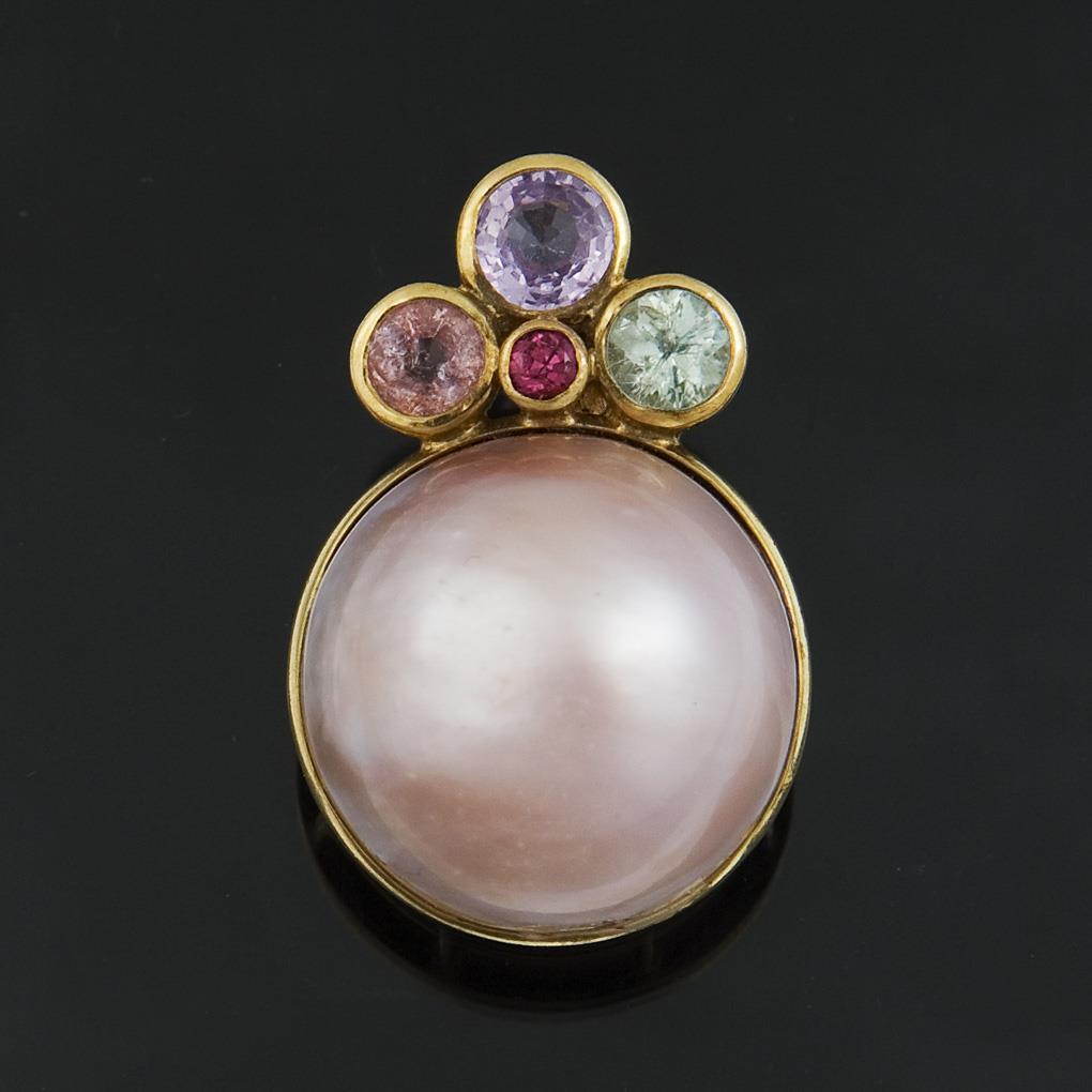 Roséfarbene Mabe-Zuchtperle ø 17,5 mm. 4 facettierte pastellfarbene Schmucksteine in Zargenfassungen, Punzen: Feingehalt.