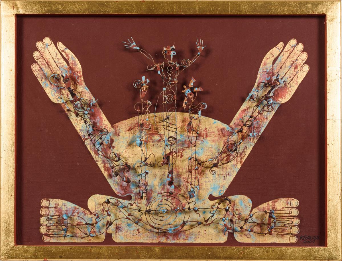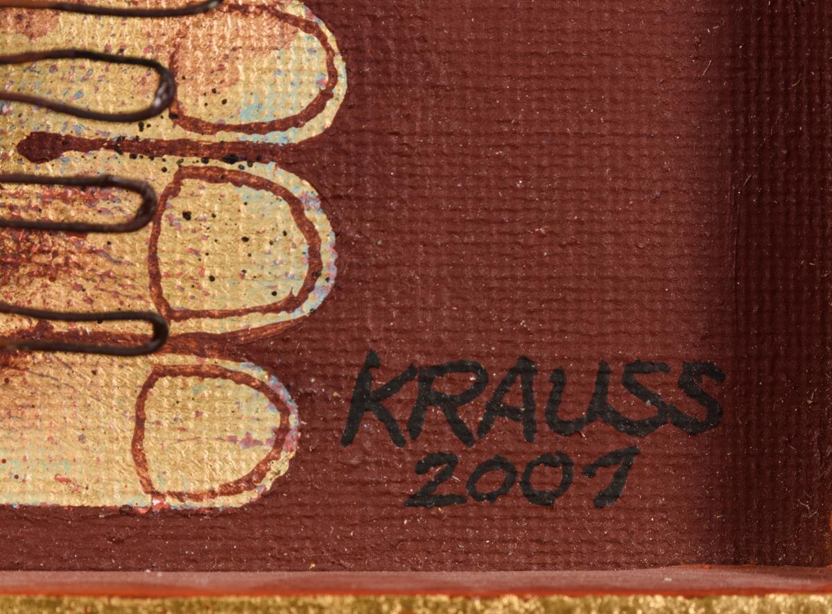 Mischtechnik/Leinwand/Holz mit figürlichen Metallapplikationen. Rechts unten signiert, verso betitelt. Datiert: 2001.