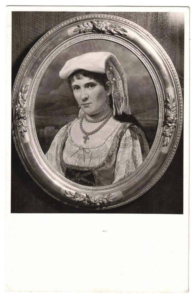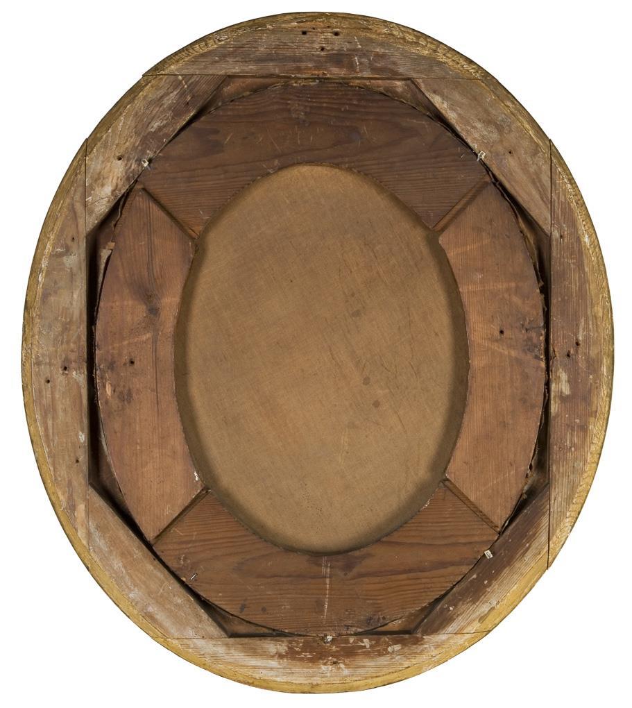 Dabei eine alte Postkarte mit einer Schwarzweiß-Fotografie des Gemäldes. Originaler vergoldeter Stuckrahmen. Craquelé, partiell kleine Farbabplatzer, Rahmen leicht defekt.