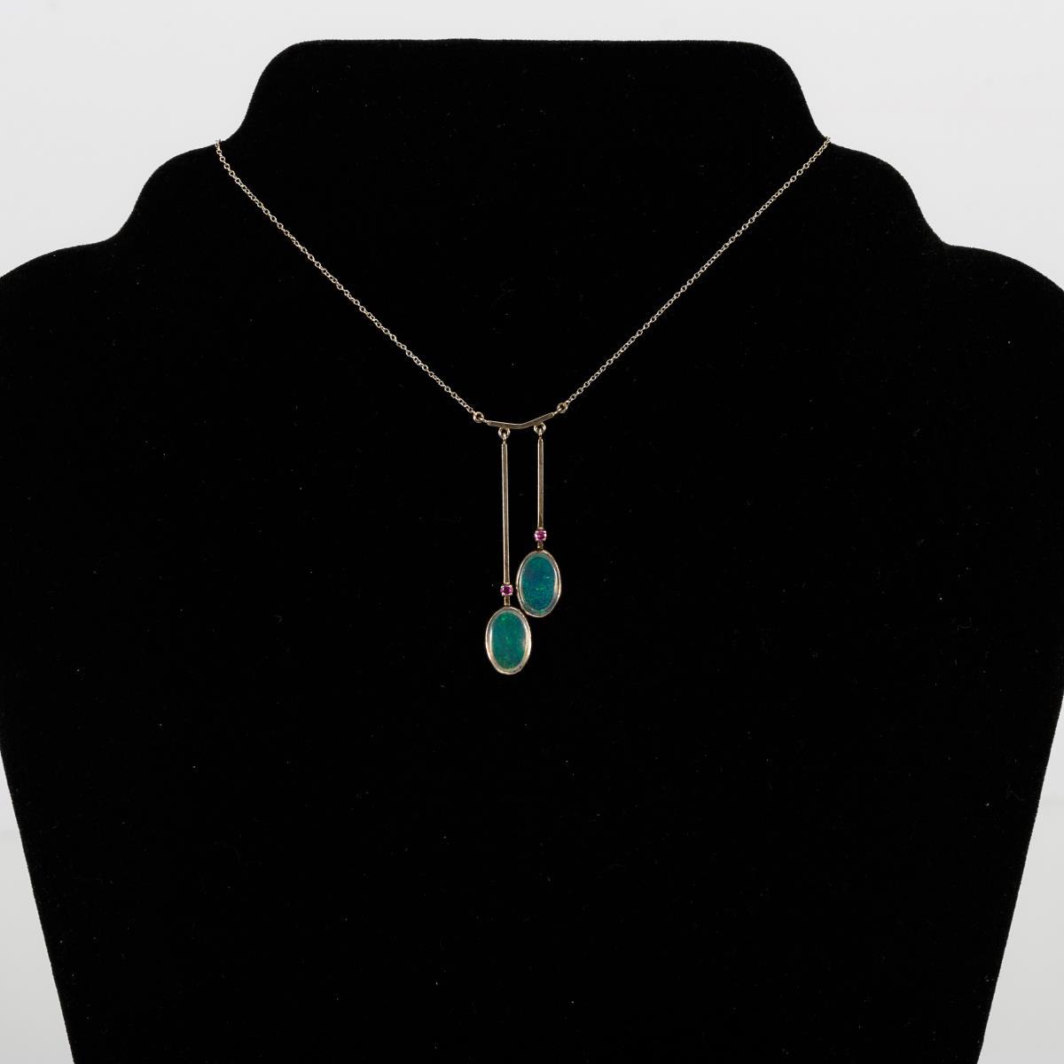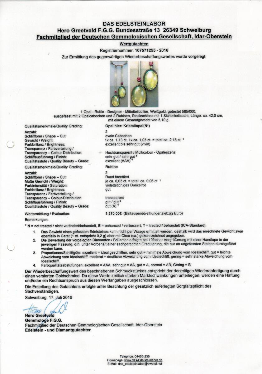 Weißgold 585 geprüft. Opale zus. ca. 2,18 ct, Rubine zus. ca. 0,05 ct. Kette L 42,5 cm. 5,1 g.