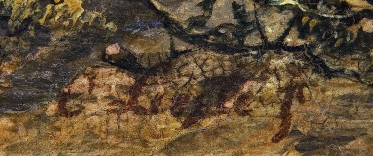 Wie eine Schritt für Schritt in die Tiefe führende Raumbühne, in der die Landschaft die Hauptrolle, die Figuren aber eine Nebenrolle spielen. Schlichter Profilrahmen. Im Himmel kleiner Farbabplatzer.