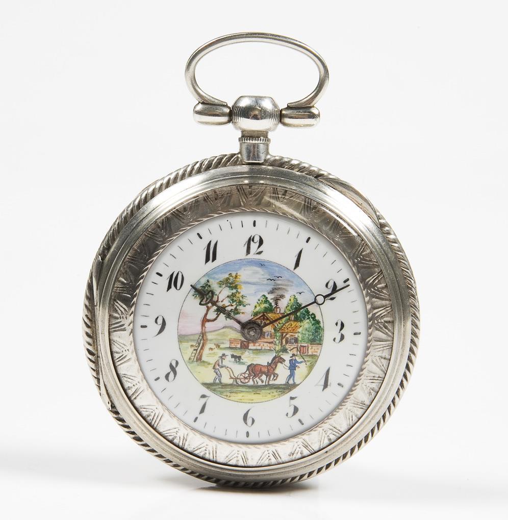 Werk signiert. Graviertes Gehäuse mit Wiener Punze von 1847. Spindelwerk mit Kette und Schnecke, filigran durchbrochen gearbeiteter Kloben, floral gravierte Platine. Weißes Emailzifferblatt, schwarze arabische Zahlen, mittig farbig gemalte bäuerliche Genreszene, Schlüsselaufzug. Im Kurzzeit-Test funktionstüchtig. Gehäuseboden mit minimalem Riss.