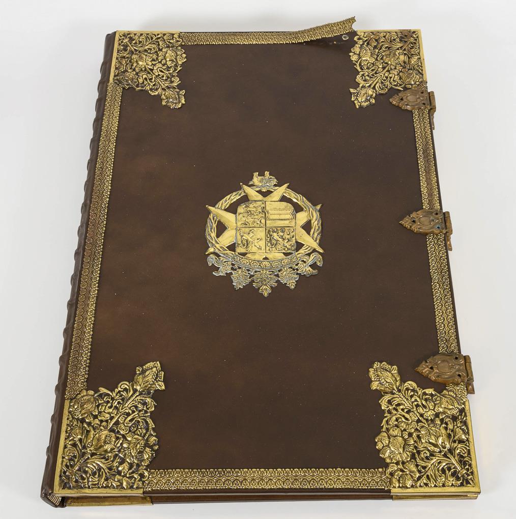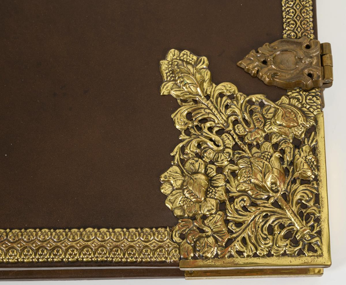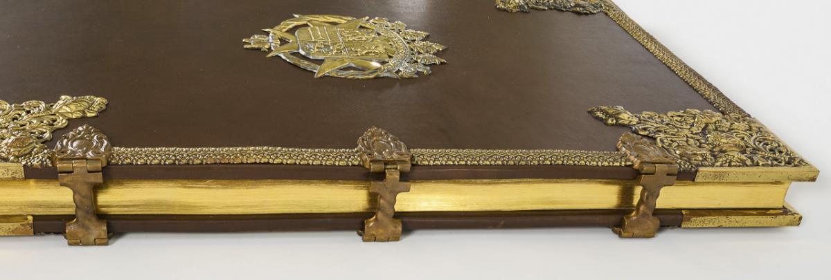 Sehr großformatiges Buch der verkleinerten Faksimile-Ausgabe des in der Deutschen Staatsbibliothek Berlin befindlichen Originales. Nummeriertes Exemplar 318/750. Ganzledereinband auf echten Bünden, mit Metallapplikationen, Wappen und Schließen. Ohne Kommentarband, eine Metallapplikation etwas gelöst.