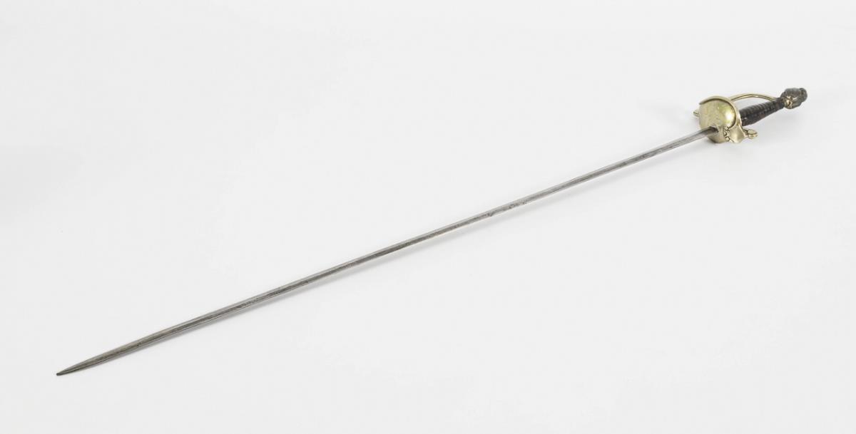 Kurze, gerade Klinge mit Mittelgrat. Halbes Stichblatt (etwas locker), zwei kleine Fingergriffe, Griff mit Lederwicklung. Silberknauf in Form eines Helmes, Spitze angeschliffen, Angel sichtbar.