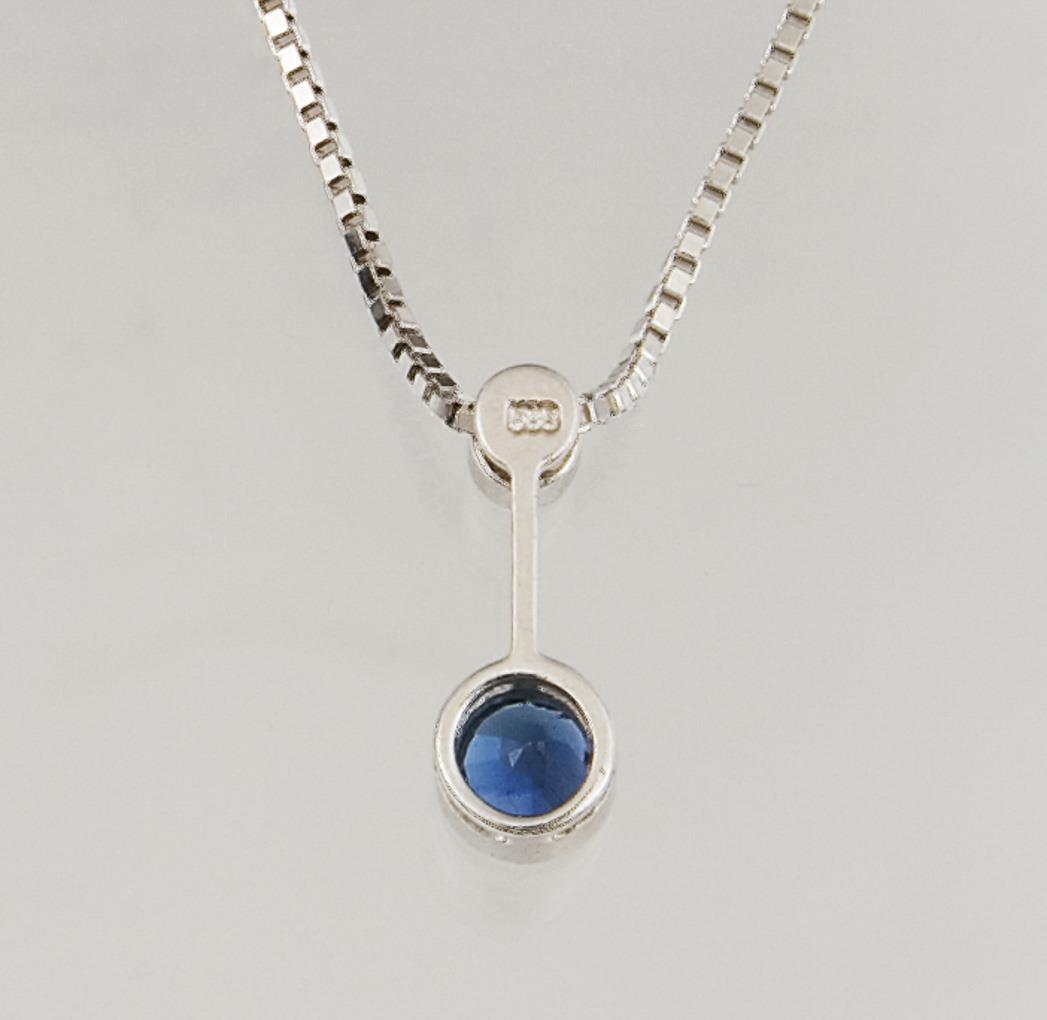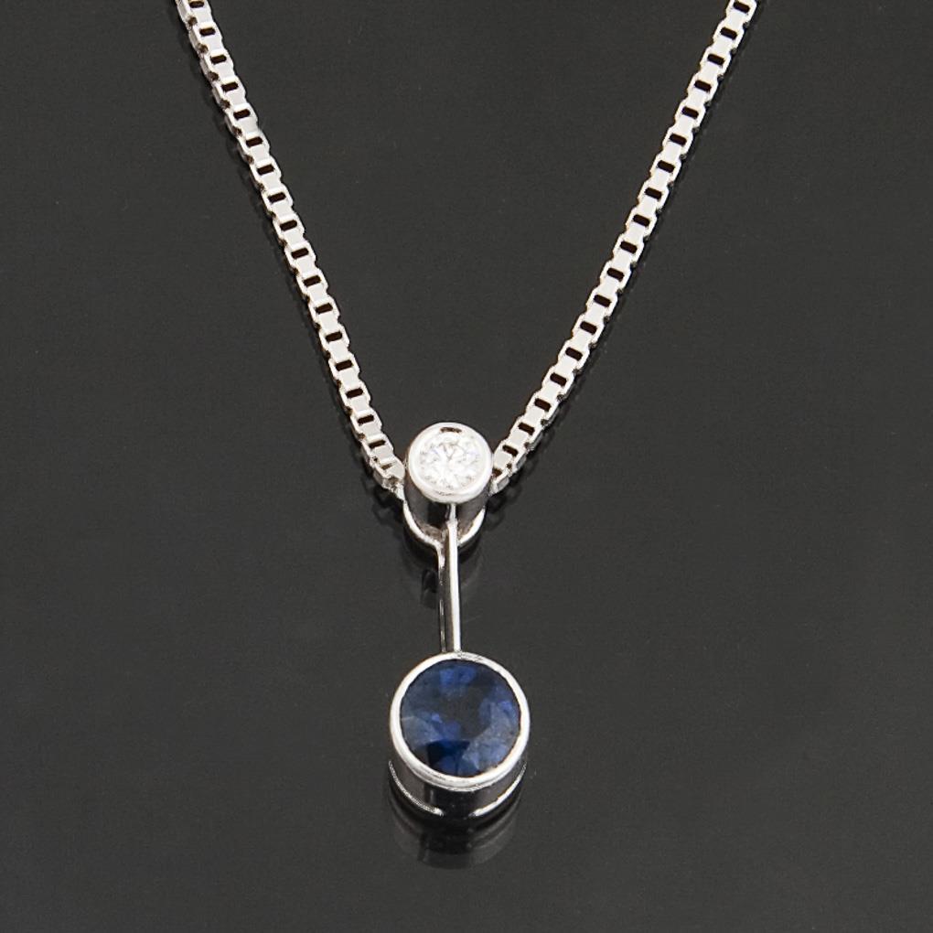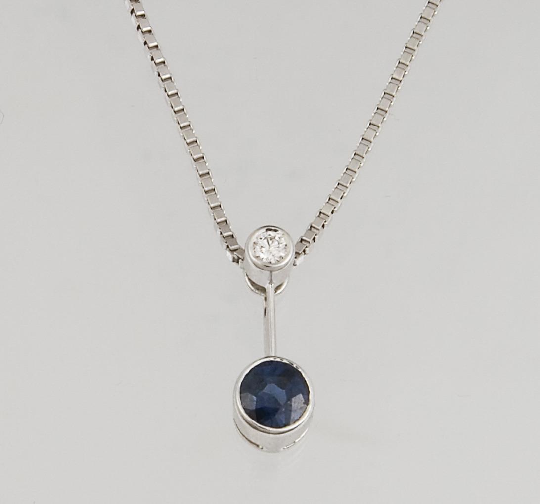 Kleiner Saphir, kleiner Brillant in runder Zargenfassung. Grazile Kette mit Federring. Punzen: Feingehalt, Kette mit Juweliermarke FBM (Friedrich Binder, Mönsheim).