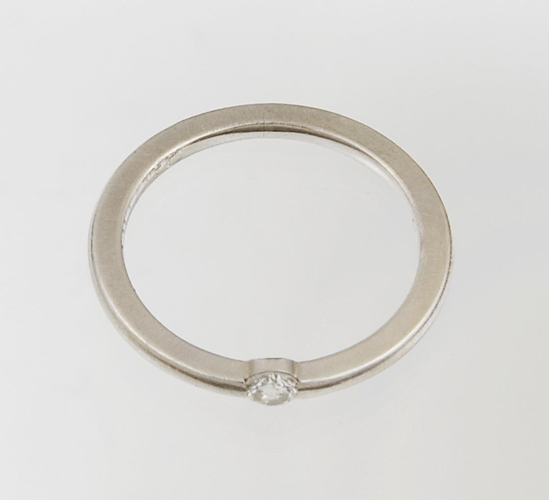Brillant 0,10 ct TWVS in Zargenfasung, stabile volle Schiene. Punzen: Feingehalt, Brillant-Daten eingraviert.